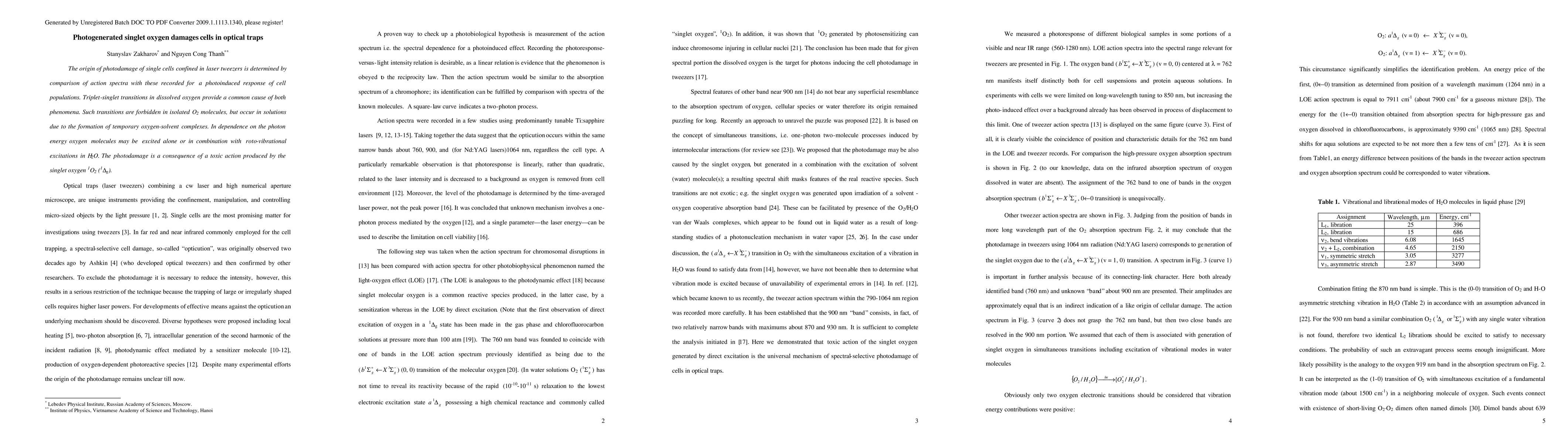 The origin of photodamage of single cells confined in laser tweezers is determined by comparison of action spectra with these recorded for a photoinduced response of cell populations. Triplet-singlet transitions in dissolved oxygen provide a common cause of both phenomena. Such transitions are forbidden in isolated O2 molecules, but occur in solutions due to the formation of temporary oxygen-solvent complexes. In dependence on the photon energy oxygen molecules may be excited alone or in combination with roto-vibrational excitations in H2O. The photodamage is a consequence of a toxic action produced by the singlet oxygen 1O2 (1.DELTA.gO2.).