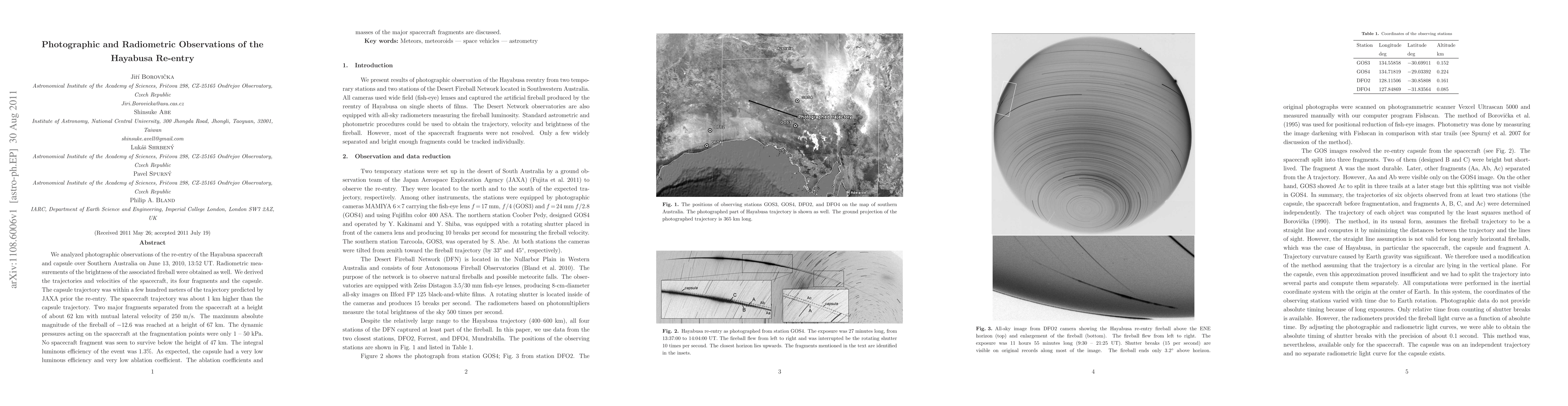 The study analyzed the re-entry of Japan's Hayabusa spacecraft and capsule over Australia in 2010. It found that the capsule's trajectory closely matched predictions, while the spacecraft was higher. Two major fragments separated at 62 km, with low dynamic pressures. No fragments survived below 47 km, and the event had a low luminous efficiency of 1.3%. The capsule had very low luminous efficiency and ablation coefficient.