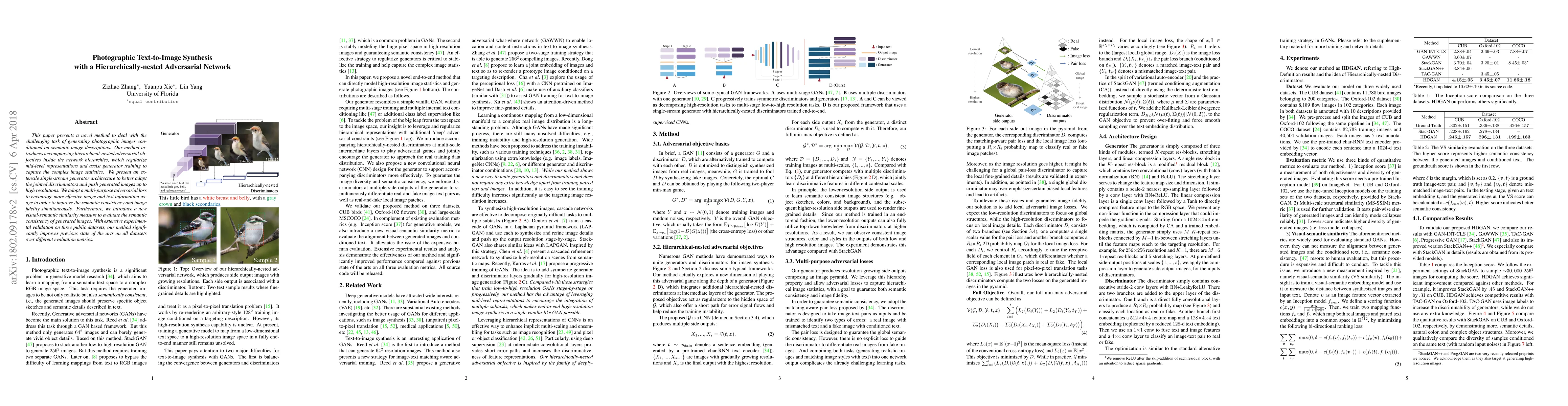 This paper presents a novel method to deal with the challenging task of generating photographic images conditioned on semantic image descriptions. Our method introduces accompanying hierarchical-nested adversarial objectives inside the network hierarchies, which regularize mid-level representations and assist generator training to capture the complex image statistics. We present an extensile single-stream generator architecture to better adapt the jointed discriminators and push generated images up to high resolutions. We adopt a multi-purpose adversarial loss to encourage more effective image and text information usage in order to improve the semantic consistency and image fidelity simultaneously. Furthermore, we introduce a new visual-semantic similarity measure to evaluate the semantic consistency of generated images. With extensive experimental validation on three public datasets, our method significantly improves previous state of the arts on all datasets over different evaluation metrics.