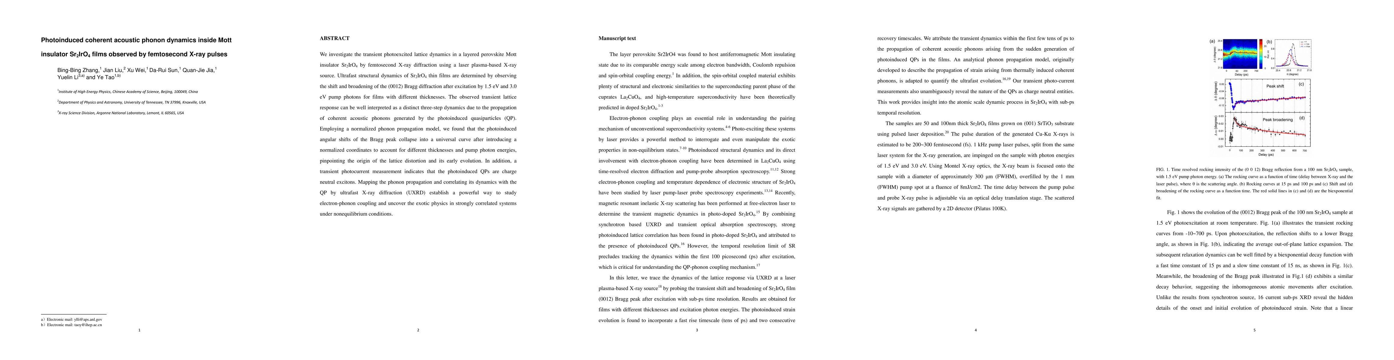This study uses femtosecond X-ray pulses to observe the transient lattice dynamics in Sr2IrO4 films following photoexcitation, revealing a three-step coherent acoustic phonon propagation linked to photoinduced quasiparticles. The findings highlight a universal curve for phonon dynamics, underscoring the potential of ultrafast X-ray diffraction to study electron-phonon coupling in strongly correlated materials.