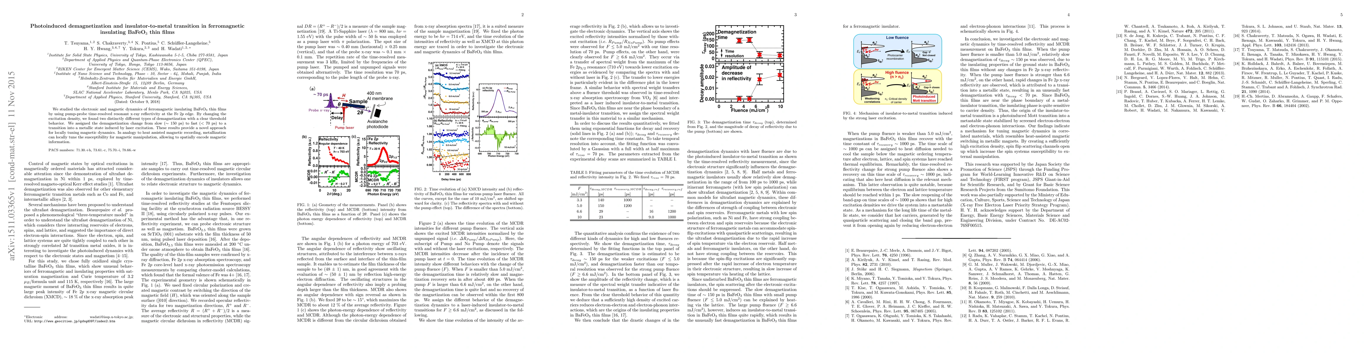 This paper investigates the electronic and magnetic dynamics of BaFeO$_3$ thin films using pump-probe techniques, revealing two distinct demagnetization types with a threshold behavior. The transition from slow to fast demagnetization is attributed to a laser-induced insulator-to-metal transition, offering a novel method for spatially encoding magnetic information.