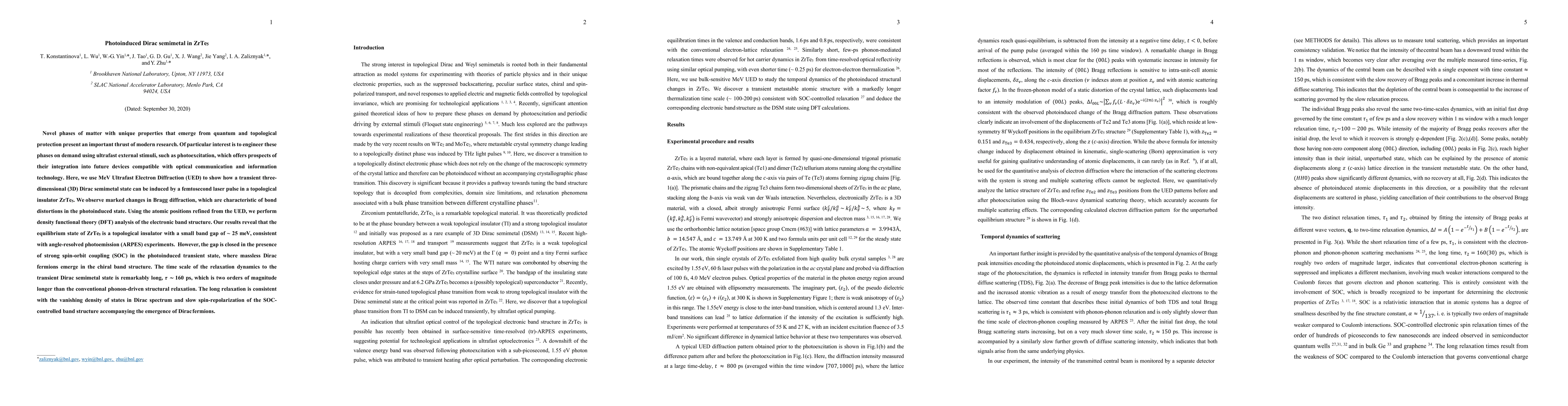 Novel phases of matter with unique properties that emerge from quantum and topological protection present an important thrust of modern research. Of particular interest is to engineer these phases on demand using ultrafast external stimuli, such as photoexcitation, which offers prospects of their integration into future devices compatible with optical communication and information technology. Here, we use MeV Ultrafast Electron Diffraction (UED) to show how a transient three-dimensional (3D) Dirac semimetal state can be induced by a femtosecond laser pulse in a topological insulator ZrTe$_5$. We observe marked changes in Bragg diffraction, which are characteristic of bond distortions in the photoinduced state. Using the atomic positions refined from the UED, we perform density functional theory (DFT) analysis of the electronic band structure. Our results reveal that the equilibrium state of ZrTe$_5$ is a topological insulator with a small band gap of $\sim$25 meV, consistent with angle-resolved photoemission (ARPES) experiments. However, the gap is closed in the presence of strong spin-orbit coupling (SOC) in the photoinduced transient state, where massless Dirac fermions emerge in the chiral band structure. The time scale of the relaxation dynamics to the transient Dirac semimetal state is remarkably long, $\tau \sim$160 ps, which is two orders of magnitude longer than the conventional phonon-driven structural relaxation. The long relaxation is consistent with the vanishing density of states in Dirac spectrum and slow spin-repolarization of the SOC-controlled band structure accompanying the emergence of Dirac fermions.