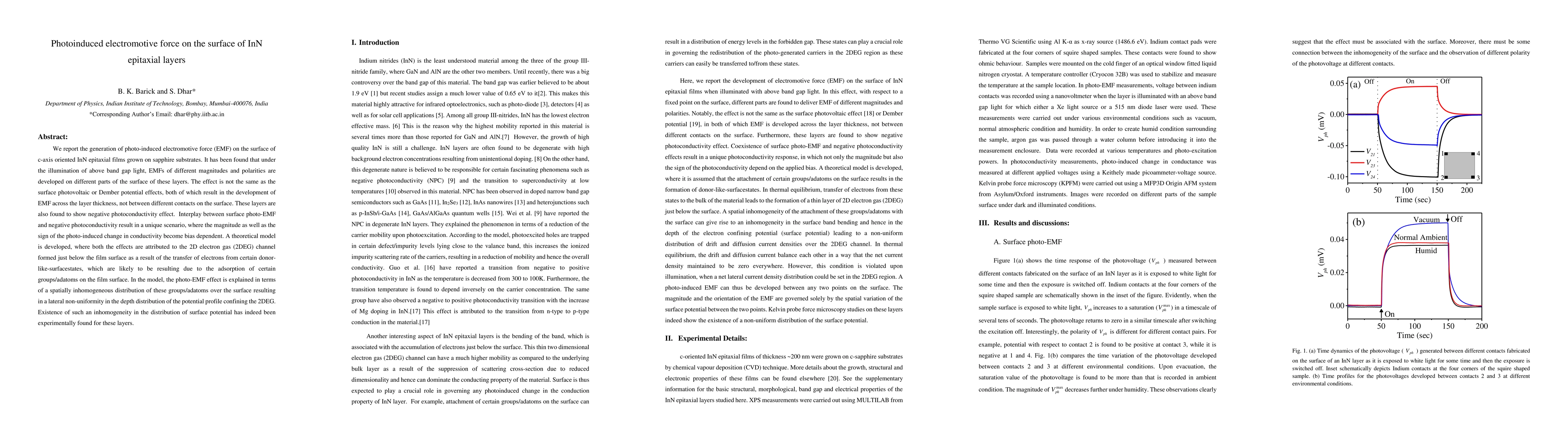 We report the generation of photo-induced electromotive force (EMF) on the surface of c-axis oriented InN epitaxial films grown on sapphire substrates. It has been found that under the illumination of above band gap light, EMFs of different magnitudes and polarities are developed on different parts of the surface of these layers. The effect is not the same as the surface photovoltaic or Dember potential effects, both of which result in the development of EMF across the layer thickness, not between different contacts on the surface. These layers are also found to show negative photoconductivity effect. Interplay between surface photo-EMF and negative photoconductivity result in a unique scenario, where the magnitude as well as the sign of the photo-induced change in conductivity become bias dependent. A theoretical model is developed, where both the effects are attributed to the 2D electron gas (2DEG) channel formed just below the film surface as a result of the transfer of electrons from certain donor-like-surfacestates, which are likely to be resulting due to the adsorption of certain groups/adatoms on the film surface. In the model, the photo-EMF effect is explained in terms of a spatially inhomogeneous distribution of these groups/adatoms over the surface resulting in a lateral non-uniformity in the depth distribution of the potential profile confining the 2DEG. Existence of such an inhomogeneity in the distribution of surface potential has indeed been experimentally found for these layers.