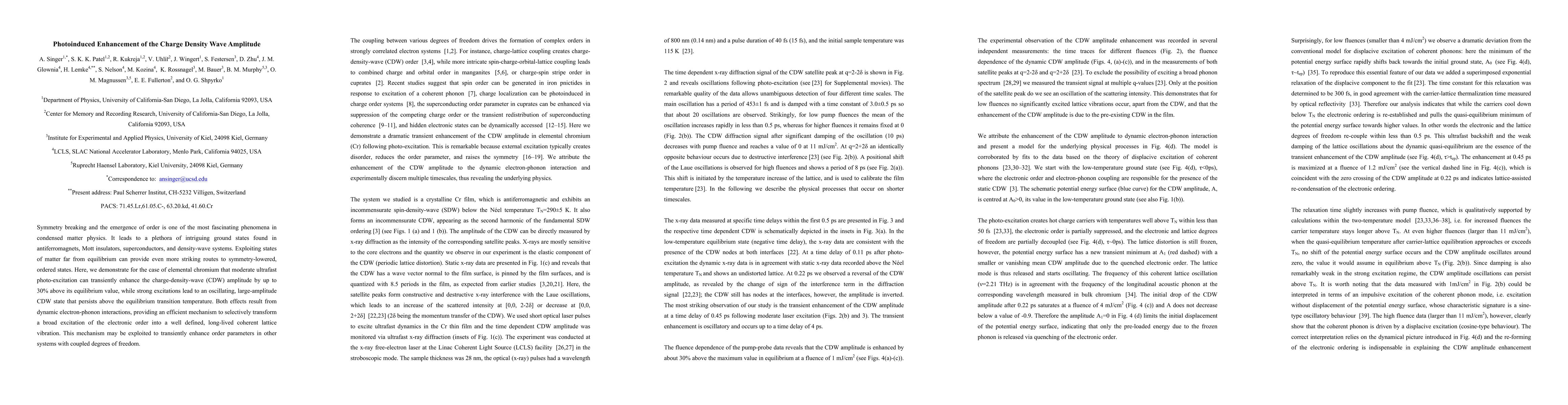 The research demonstrates that moderate ultrafast photo-excitation can temporarily increase the charge-density-wave (CDW) amplitude in elemental chromium by up to 30% beyond its equilibrium value. Stronger excitations create an oscillating, large-amplitude CDW state that remains above the equilibrium transition temperature, both effects arising from dynamic electron-phonon interactions. This method offers a way to transiently boost order parameters in similar systems with interconnected degrees of freedom.