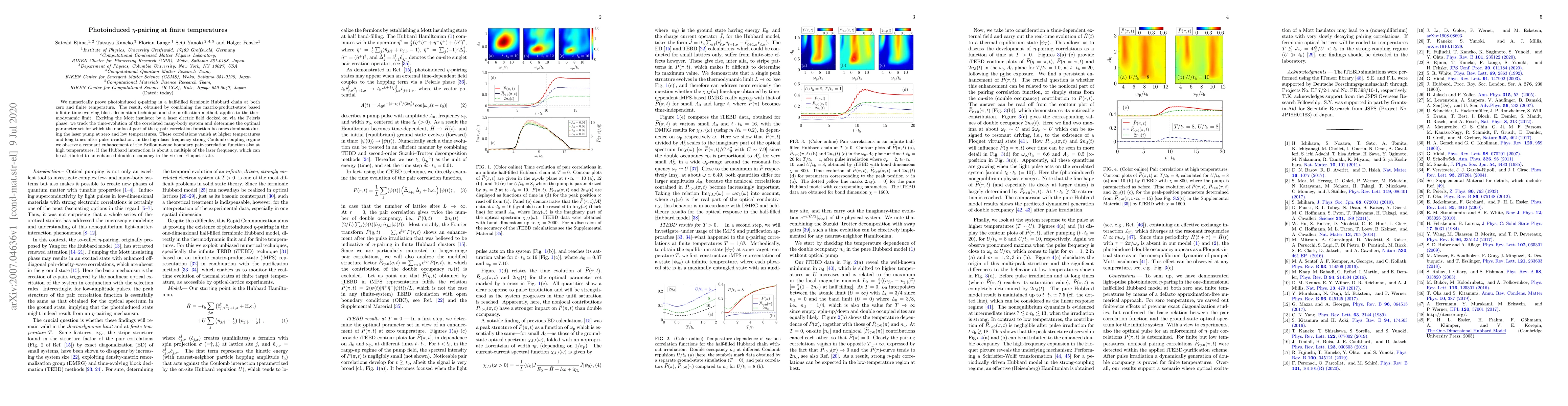 We numerically prove photoinduced $\eta$-pairing in a half-filled fermionic Hubbard chain at both zero and finite temperature. The result, obtained by combining the matrix-product-state based infinite time-evolving block decimation technique and the purification method, applies to the thermodynamic limit. Exciting the Mott insulator by a laser electric field docked on via the Peierls phase, we track the time-evolution of the correlated many-body system and determine the optimal parameter set for which the nonlocal part of the $\eta$-pair correlation function becomes dominant during the laser pump at zero and low temperatures. These correlations vanish at higher temperatures and long times after pulse irradiation. In the high laser frequency strong Coulomb coupling regime we observe a remnant enhancement of the Brillouin-zone boundary pair-correlation function also at high temperatures, if the Hubbard interaction is about a multiple of the laser frequency, which can be attributed to an enhanced double occupancy in the virtual Floquet state.