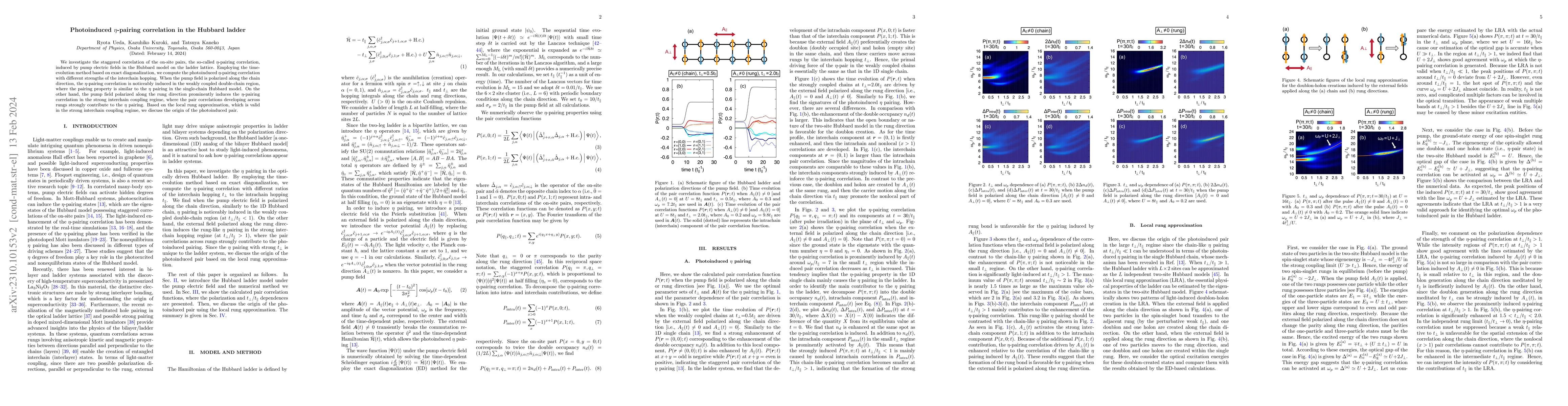 This paper investigates the photoinduced $\eta$-pairing correlation in the Hubbard ladder model under electric fields. It finds that the pump field's polarization direction significantly influences the $\eta$-pairing correlation, with different strengths of interchain hopping affecting the pairing properties across the ladder.