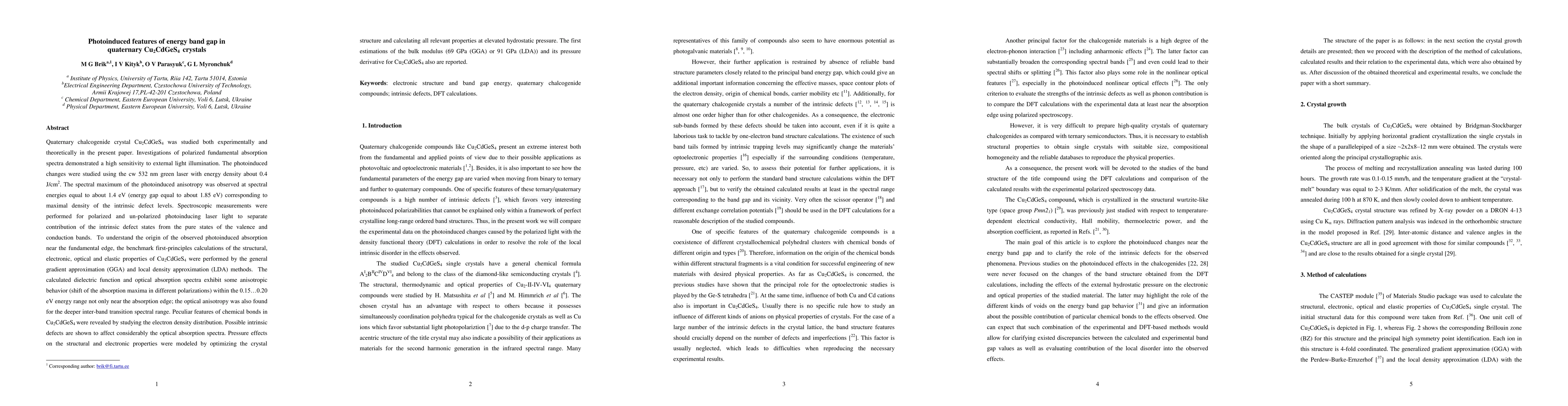 Quaternary chalcogenide crystal Cu2CdGeS4 was studied both experimentally and theoretically in the present paper. Investigations of polarized fundamental absorption spectra demonstrated a high sensitivity to external light illumination. The photoinduced changes were studied using the cw 532 nm green laser with energy density about 0.4 J/cm2. The spectral maximum of the photoinduced anisotropy was observed at spectral energies equal to about 1.4 eV (energy gap equal to about 1.85 eV) corresponding to maximal density of the intrinsic defect levels. Spectroscopic measurements were performed for polarized and un-polarized photoinducing laser light to separate contribution of the intrinsic defect states from the pure states of the valence and conduction bands. To understand the origin of the observed photoinduced absorption near the fundamental edge, the benchmark first-principles calculations of the structural, electronic, optical and elastic properties of Cu2CdGeS4 were performed in the general gradient approximation (GGA) and local density approximation (LDA) approaches. The calculated dielectric function and optical absorption spectra exhibit some anisotropic behavior within the 0.15...0.20 eV energy range near the absorption edge; the optical anisotropy was also found in the deep inter-band transition spectral range. Peculiar features of chemical bonds in Cu2CdGeS4 were revealed by studying the electron density distribution. Possible intrinsic defects are shown to affect considerably the optical absorption spectra. Pressure effects on the structural and electronic properties were modeled by optimizing the crystal structure and calculating all relevant properties at elevated hydrostatic pressure. The first estimations of the bulk modulus (69 GPa (GGA) or 91 GPa (LDA)) and its pressure derivative for Cu2CdGeS4 are reported.