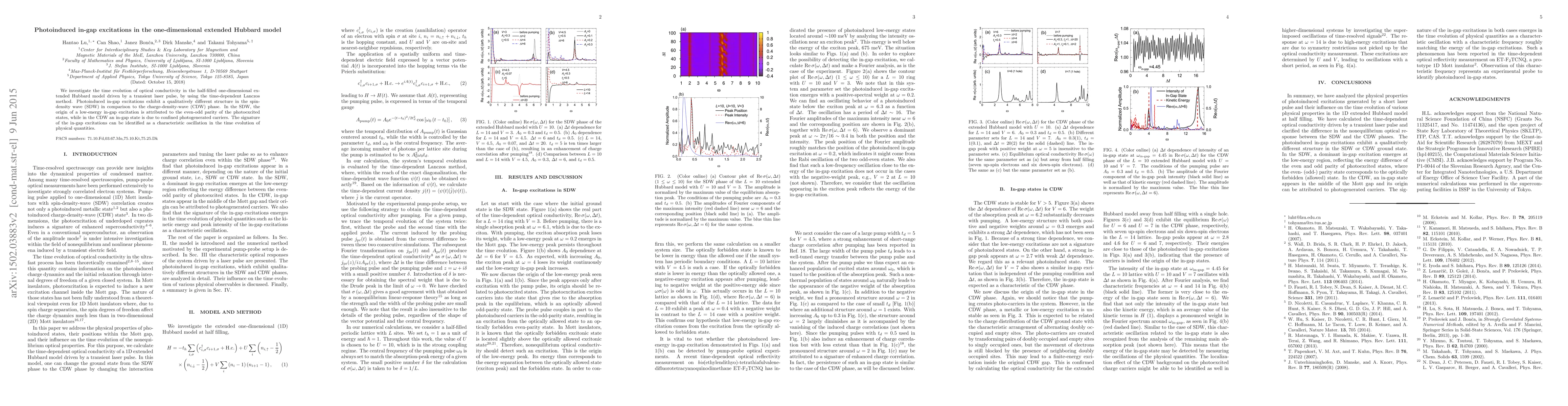 This paper examines the optical conductivity dynamics in the one-dimensional extended Hubbard model under a laser pulse, using the time-dependent Lanczos method. It reveals distinct photoinduced in-gap excitations in spin-density and charge-density wave phases, with different origins for the excitations in each phase.
