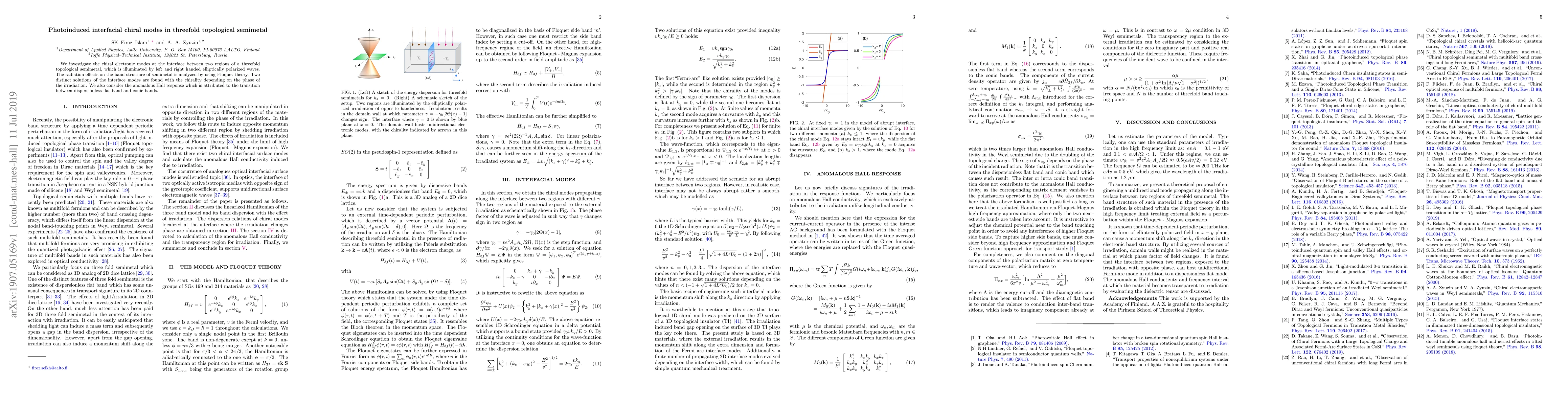 We investigate the chiral electronic modes at the interface between two regions of a threefold topological semimetal, which is illuminated by left and right handed elliptically polarized waves. The radiation effects on the band structure of semimetal is analyzed by using Floquet theory. Two distinct solutions of the interface modes are found with the chirality depending on the phase of the irradiation. We also consider the anomalous Hall response which is attributed to the transition between dispersionless flat band and conic bands.
