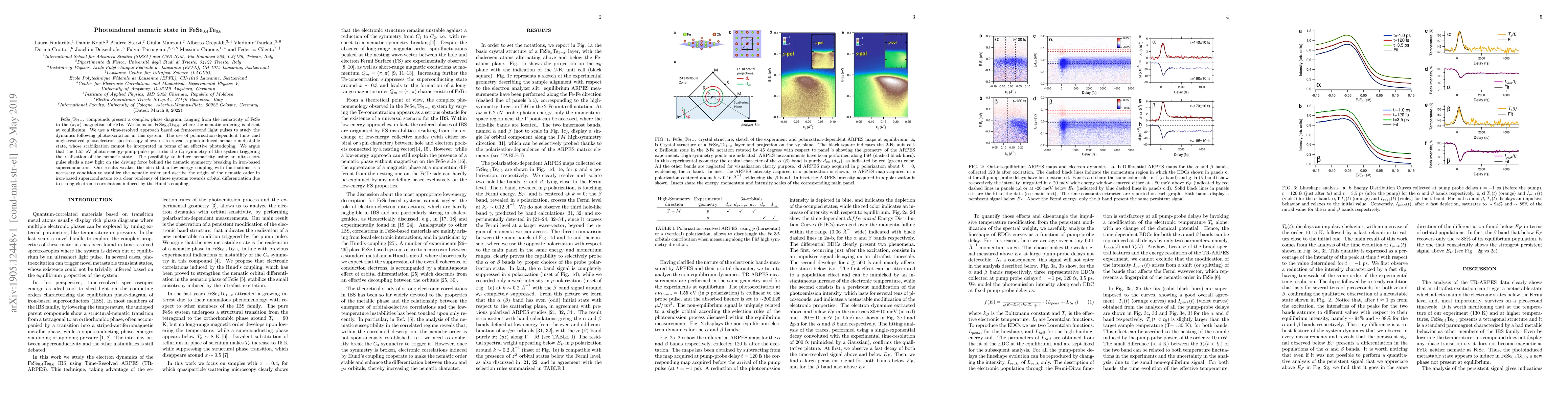 FeSe$_{x}$Te$_{1-x}$ compounds present a complex phase diagram, ranging from the nematicity of FeSe to the $(\pi, \pi)$ magnetism of FeTe. We focus on FeSe$_{0.4}$Te$_{0.6}$, where the nematic ordering is absent at equilibrium. We use a time-resolved approach based on femtosecond light pulses to study the dynamics following photoexcitation in this system. The use of polarization-dependent time- and angle-resolved photoelectron spectroscopy allows us to reveal a photoinduced nematic metastable state, whose stabilization cannot be interpreted in terms of an effective photodoping. We argue that the 1.55 eV photon-energy-pump-pulse perturbs the $C_4$ symmetry of the system triggering the realization of the nematic state. The possibility to induce nematicity using an ultra-short pulse sheds a new light on the driving force behind the nematic symmetry breaking in iron-based superconductors. Our results weaken the idea that a low-energy coupling with fluctuations is a necessary condition to stabilize the nematic order and ascribe the origin of the nematic order in iron-based superconductors to a clear tendency of those systems towards orbital differentiation due to strong electronic correlations induced by the Hund's coupling.