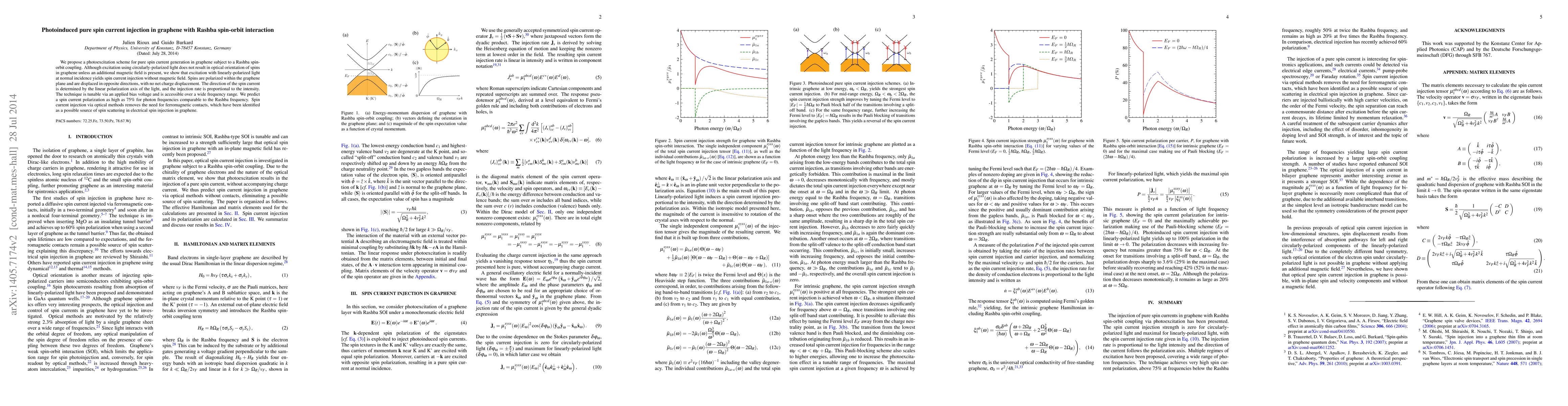 The paper presents a detailed theoretical framework for photoinduced pure spin current injection in graphene with Rashba spin-orbit interaction, including the derivation of the spin current injection rate and response tensor.