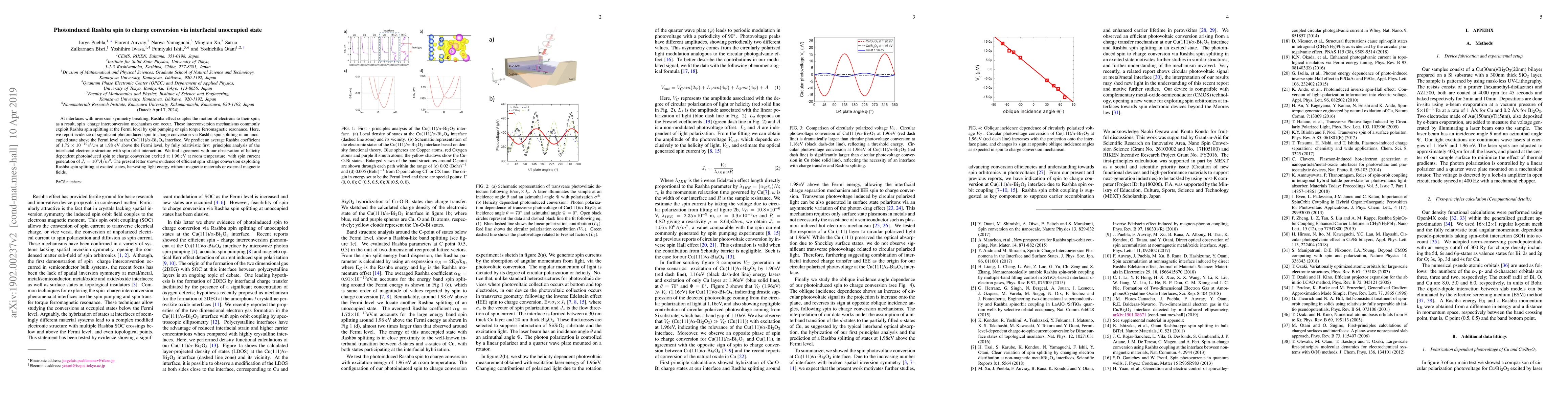This paper reports photoinduced spin to charge conversion via Rashba spin splitting in unoccupied states at the Cu(111)/α-Bi₂O₃ interface, revealing efficient conversion at 1.96 eV without magnetic materials or fields, and predicting a Rashba coefficient of $1.72\times 10^{-10}eV.m$ from first-principles analysis.