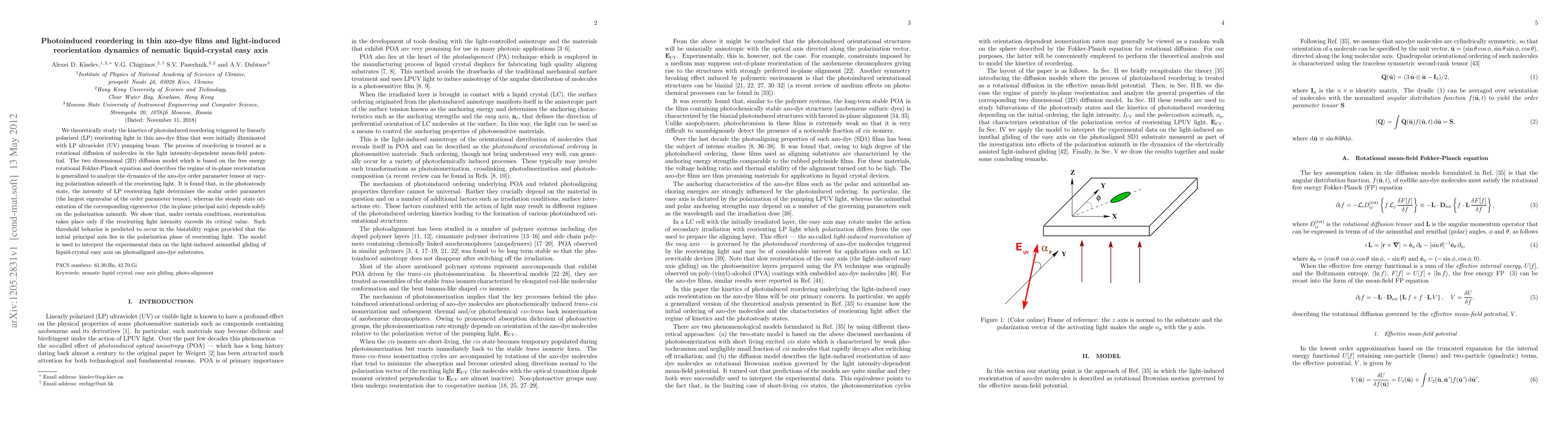 This paper theoretically investigates the kinetics of photoinduced reordering in thin azo-dye films under linearly polarized light, revealing that light intensity determines the scalar order parameter while polarization azimuth dictates the orientation of the principal axis. The study also predicts a threshold behavior for reorientation in the bistability region.