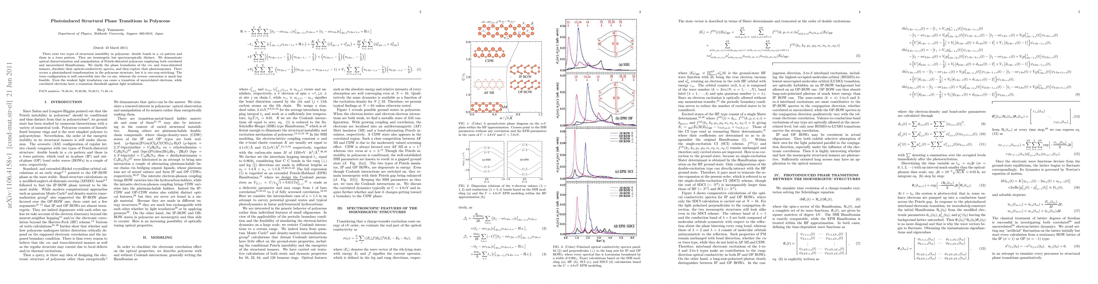 The research paper investigates polyacene's structural phase transitions via optical means, distinguishing between cis and trans double-bond patterns. It reveals one-way photoinduced switching from trans to cis, facilitated even by weak light irradiation for uncorrelated electrons, while correlated electrons require a higher threshold.