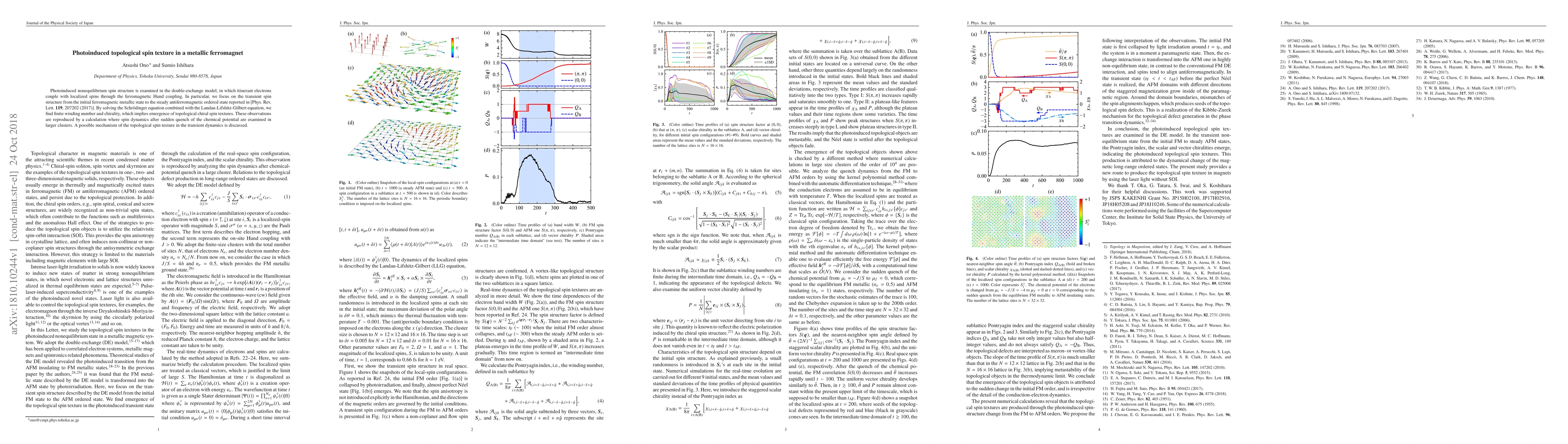 Photoinduced nonequilibrium spin structure is examined in the double-exchange model, in which itinerant electrons couple with localized spins through the ferromagnetic Hund coupling. In particular, we focus on the transient spin structure from the initial ferromagnetic metallic state to the steady antiferromagnetic ordered state reported in [Phys. Rev. Lett. 119, 207202 (2017)]. By solving the Schr\"odinger equation combined with the Landau-Lifshitz-Gilbert equation, we find finite winding number and chirality, which implies emergence of topological chiral spin textures. These observations are reproduced by a calculation where spin dynamics after sudden quench of the chemical potential are examined in larger clusters. A possible mechanism of the topological spin texture in the transient dynamics is discussed.