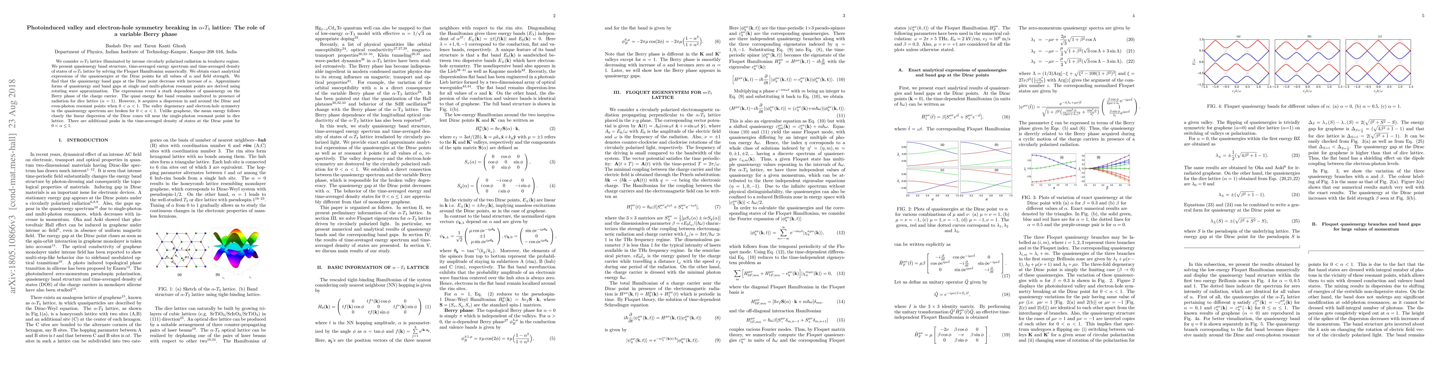 This paper investigates the photoinduced valley and electron-hole symmetry breaking in the $\alpha$-$T_3$ lattice under intense circularly polarized terahertz radiation. It reveals that the quasienergy band gaps decrease with increasing $\alpha$ and that the quasienergy spectrum exhibits a stark dependence on the Berry phase, leading to symmetry breaking for $0<\alpha<1$.