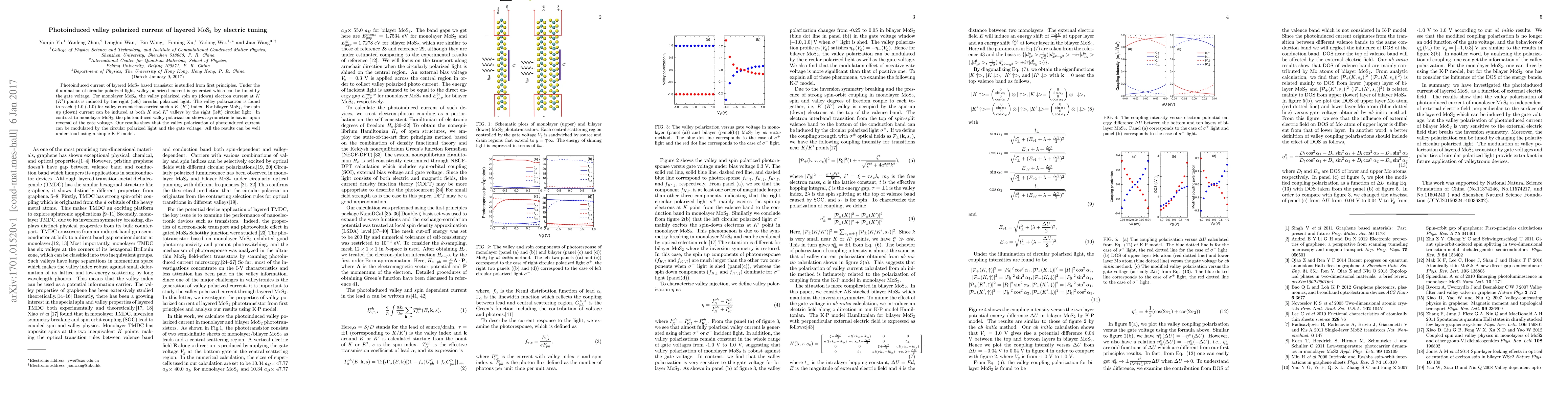 This study investigates the photoinduced valley-polarized current in layered MoS2 under circularly polarized light, revealing that the valley polarization can be tuned by gate voltage. The results show distinct behaviors in monolayer and bilayer MoS2, with the latter exhibiting asymmetric valley polarization under gate voltage reversal.
