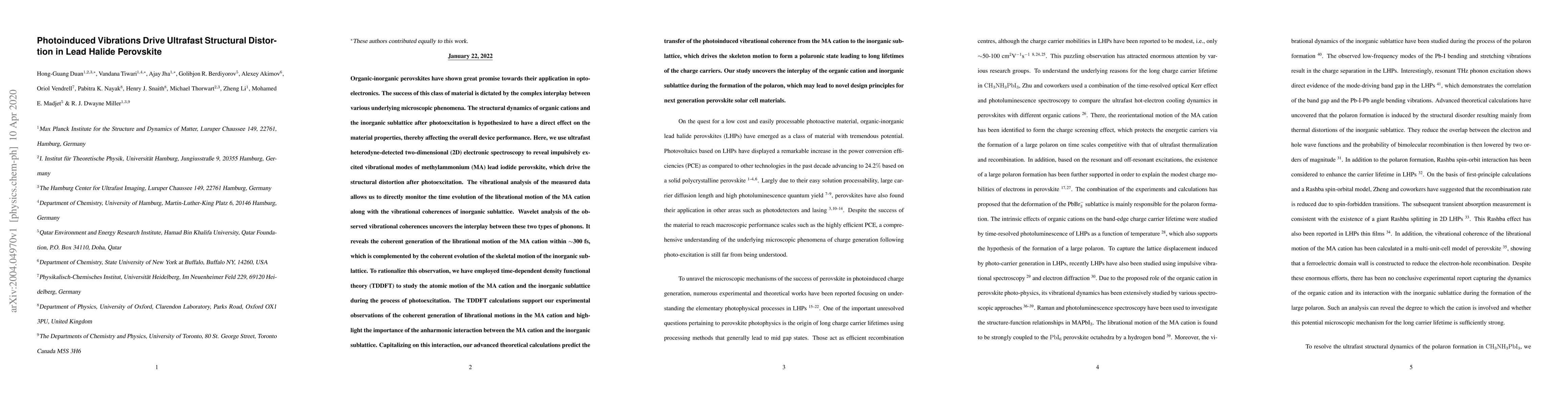 Organic-inorganic perovskites have shown great promise towards their application in optoelectronics. The success of this class of material is dictated by the complex interplay between various underlying microscopic phenomena. The structural dynamics of organic cations and the inorganic sublattice after photoexcitation is hypothesized to have a direct effect on the material properties, thereby affecting the overall device performance. Here, we use two-dimensional (2D) electronic spectroscopy to reveal impulsively excited vibrational modes of methylammonium (MA) lead iodide perovskite, which drive the structural distortion after photoexcitation. The vibrational analysis of the measured data allows us to directly monitor the time evolution of the librational motion of the MA cation along with the vibrational coherences of inorganic sublattice. Wavelet analysis of the observed vibrational coherences uncovers the interplay between these two types of phonons. It reveals the coherent generation of the librational motion of the MA cation within ~300 fs, which is complemented by the coherent evolution of the skeletal motion of the inorganic sublattice. We have employed time-dependent density functional theory (TDDFT) to study the atomic motion of the MA cation and the inorganic sublattice during the process of photoexcitation. The TDDFT calculations support our experimental observations of the coherent generation of librational motions in the MA cation and highlight the importance of the anharmonic interaction between the MA cation and the inorganic sublattice. Our calculations predict the transfer of the photoinduced vibrational coherence from the MA cation to the inorganic sublattice, which drives the skeleton motion to form a polaronic state leading to long lifetimes of the charge carriers. This work may lead to novel design principles for next generation of solar cell materials.