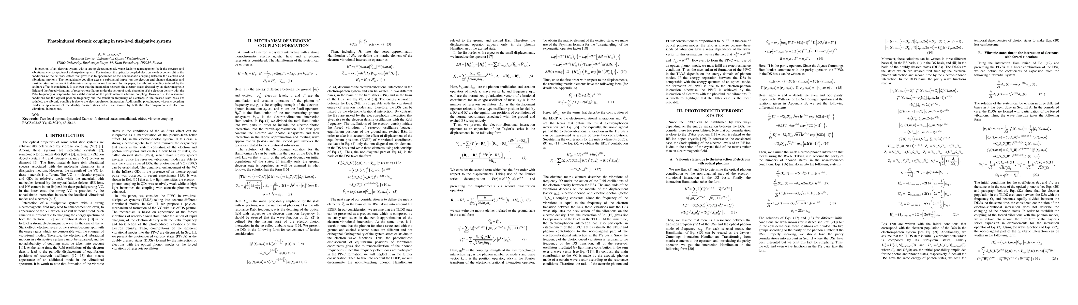 Interaction of an electron system with a strong electromagnetic wave leads to rearrangement both the electron and vibrational energy spectra of a dissipative system. For instance, the optically coupled electron levels become split in the conditions of the ac Stark effect that gives rise to appearance of the nonadiabatic coupling between the electron and vibrational motions. The nonadiabatic coupling exerts a substantial impact on the electron and phonon dynamics and must be taken into account to determine the system wave functions. In this paper, the vibronic coupling induced by the ac Stark effect is considered. It is shown that the interaction between the electron states dressed by an electromagnetic field and the forced vibrations of reservoir oscillators under the action of rapid changing of the electron density with the Rabi frequency is responsible for establishment of the photoinduced vibronic coupling. However, if the resonance conditions for the optical phonon frequency and the transition frequency of electrons in the dressed state basis are satisfied, the vibronic coupling is due to the electron-phonon interaction. Additionally, photoinduced vibronic coupling results in appearance of the doubly dressed states which are formed by both the electron-photon and electron-vibrational interactions.