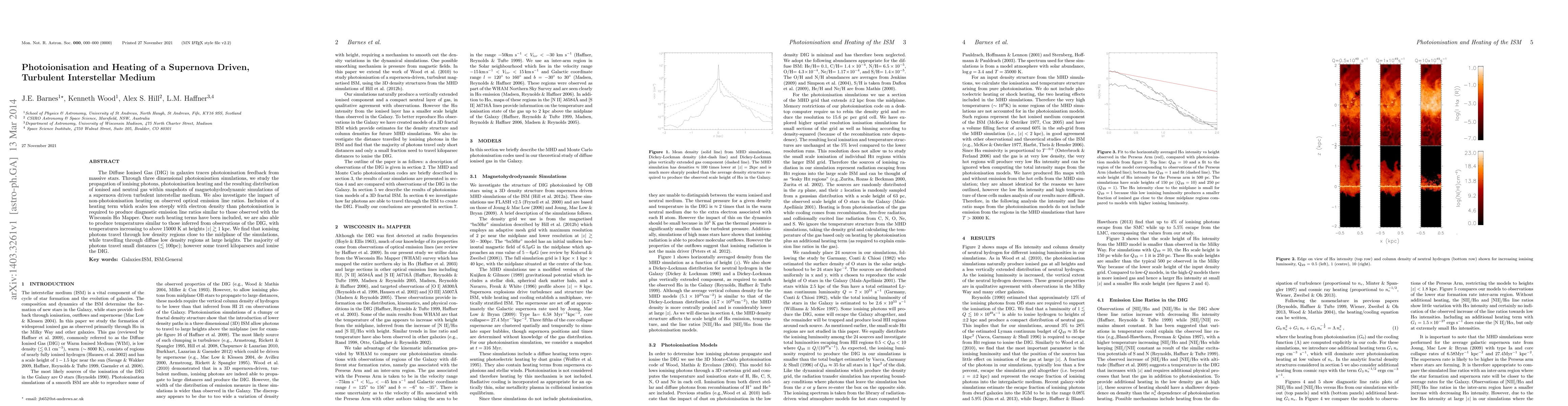 This paper investigates the photoionisation and heating effects in a supernova-driven turbulent interstellar medium using 3D simulations. It finds that ionising photons predominantly travel through low-density regions, with some reaching kiloparsecs and ionising the Diffuse Ionised Gas, while non-photoionisation heating is necessary to match observed optical emission line ratios and temperatures.