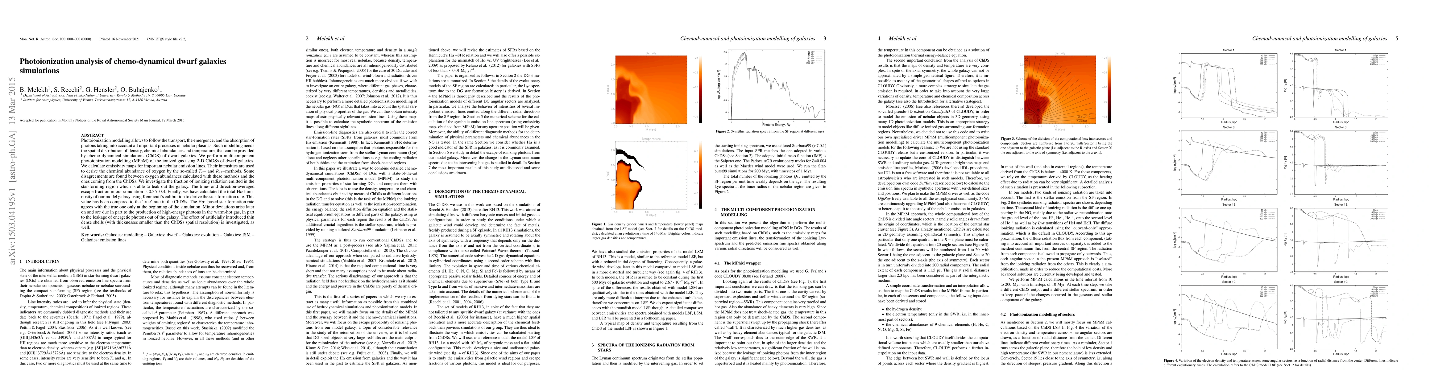 This paper investigates the photoionization of ionized gas in chemo-dynamical simulations of dwarf galaxies, finding discrepancies between oxygen abundances derived from different methods and the simulations. It also examines the escape fraction of ionizing radiation and the Halpha luminosity-based star-formation rate, which initially agrees but later diverges due to high-energy photon production and leakage.