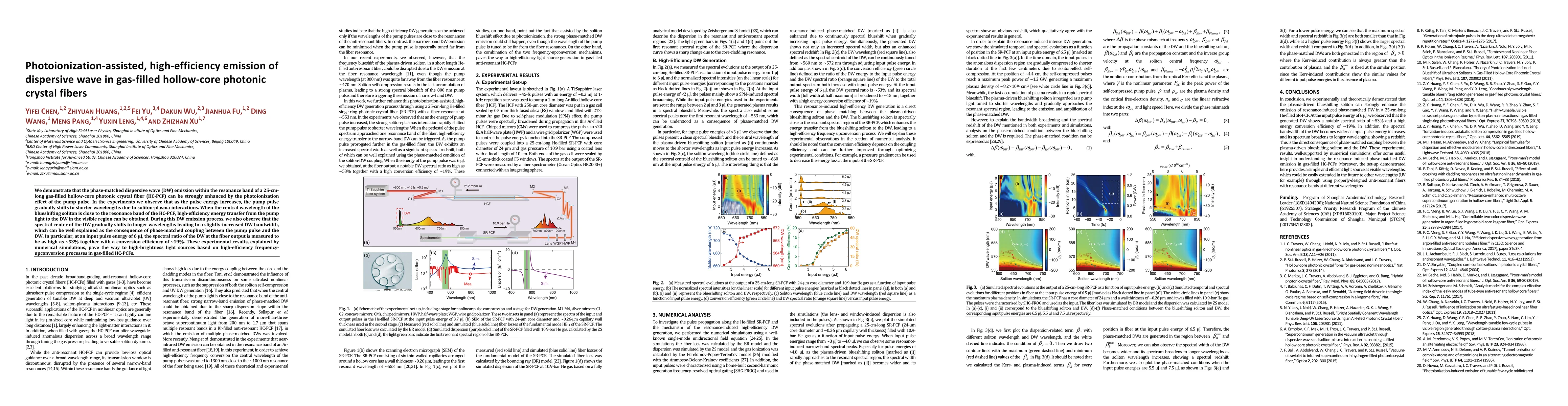 This paper demonstrates the enhancement of dispersive wave emission in gas-filled hollow-core photonic crystal fibers through photoionization-assisted phase-matching, achieving a spectral ratio of ~53% and conversion efficiency of ~19% at 6 uJ input pulse energy. The process involves soliton-plasma interactions leading to blueshifting and increased DW bandwidth.