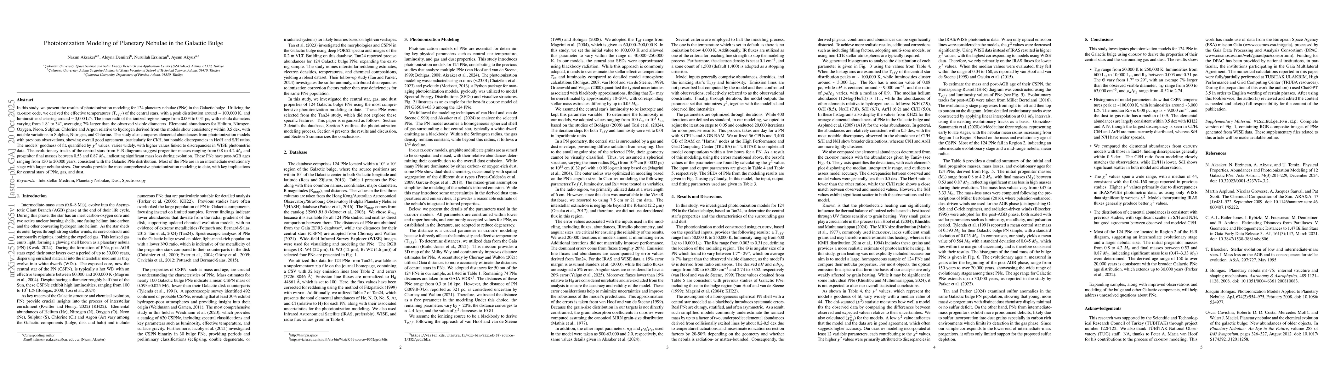 In this study, we present the results of photoionization modeling for 124 planetary nebulae (PNe) in the Galactic bulge. Utilizing the {\scshape cloudy} code, we derived the effective temperatures (T$_{eff}$) of the central stars, with a peak distribution around $\sim$ 100,000 K, and luminosities clustering around $\sim$ 3,000 L$\odot$. The inner radii of the ionized regions range from 0.003 to 0.31 pc, with nebula diameters varying from 1.8" to 34", averaging 7\% larger than the observed visible diameters. Elemental abundances for Helium, Nitrogen, Oxygen, Neon, Sulphur, Chlorine and Argon relative to hydrogen derived from the models show consistency within 0.5 dex, with notable variations in Sulphur, Nitrogen, and Chlorine. The study also compares elemental abundances from photoionization models with previous observations, showing overall good agreement, particularly for Cl/H, but notable discrepancies in He/H and S/H ratios. The models' goodness of fit, quantified by $\chi^{2}$ values, varies widely, with higher values linked to discrepancies in WISE photometric data. The evolutionary tracks of the central stars from H-R diagrams suggest progenitor masses ranging from 0.8 to 4.2 $M_\odot$ and progenitor final masses between 0.53 and 0.87 $M_\odot$, indicating significant mass loss during evolution. These PNe have post-AGB ages ranging from 150 to 20,000 years, consistent with the Galactic PNe distribution. Most of the PNe are in an intermediate evolutionary stage with larger nebular sizes. Our results provide the most comprehensive photoionization modeling to date, with key implications for central stars of PNe, gas, and dust.