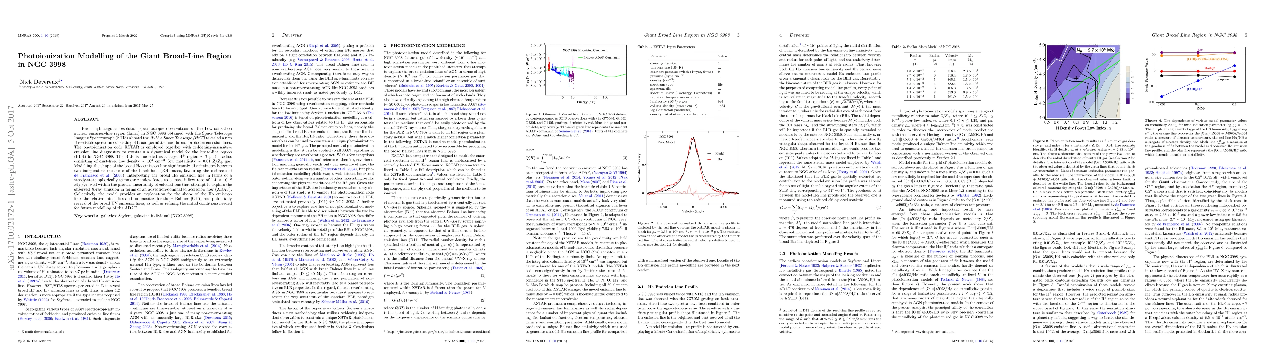 The research utilizes XSTAR photoionization code to model the broad-line region (BLR) in NGC 3998, revealing a dust-free H+ gas region of ~7 pc radius, with density ~10^4 cm^-3 and metallicity ~0.01 Z/Z☉. The model explains the broad Hα emission line, supports a specific black hole mass estimate, and suggests a mass inflow rate of 1.4 × 10^-2 M☉/yr, compatible with advection-dominated accretion flow (ADAF) theories.