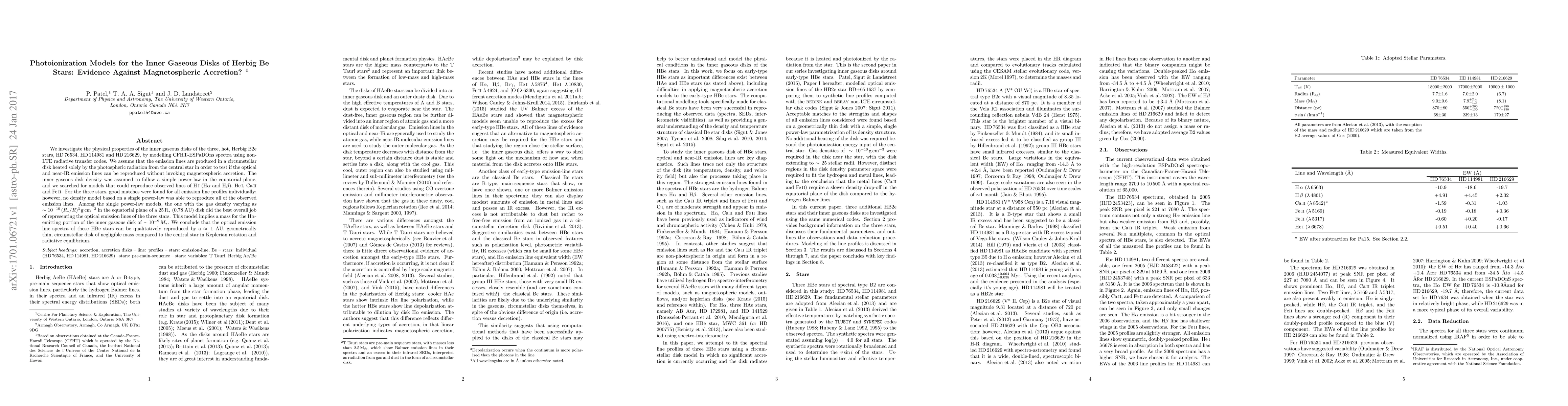 We investigate the physical properties of the inner gaseous disks of the three, hot, Herbig B2e stars, HD 76534, HD 114981 and HD 216629, by modelling CFHT-ESPaDOns spectra using non-LTE radiative transfer codes. We assume that the emission lines are produced in a circumstellar disk heated solely by the photospheric radiation from the central star in order to test if the optical and near-IR emission lines can be reproduced without invoking magnetospheric accretion. The inner gaseous disk density was assumed to follow a simple power-law in the equatorial plane, and we searched for models that could reproduce observed lines of HI (H$\alpha$ and H$\beta$), HeI, CaII and FeII. For the three stars, good matches were found for all emission line profiles individually; however, no density model based on a single power-law was able to reproduce all of the observed emission lines. Among the single power-law models, the one with the gas density varying as $\sim 10^{-10}\,(R_{*}/R)^3\, \rm g\,cm^{-3}$ in the equatorial plane of a 25 R$_{*}$ ($0.78$ AU) disk did the best overall job of representing the optical emission lines of the three stars. This model implies a mass for the H$\alpha$-emitting portion of the inner gaseous disk of $\sim 10^{-9} M_*$. We conclude that the optical emission line spectra of these HBe stars can be qualitatively reproduced by a $\approx\,1$ AU, geometrically thin, circumstellar disk of negligible mass compared to the central star in Keplerian rotation and radiative equilibrium.