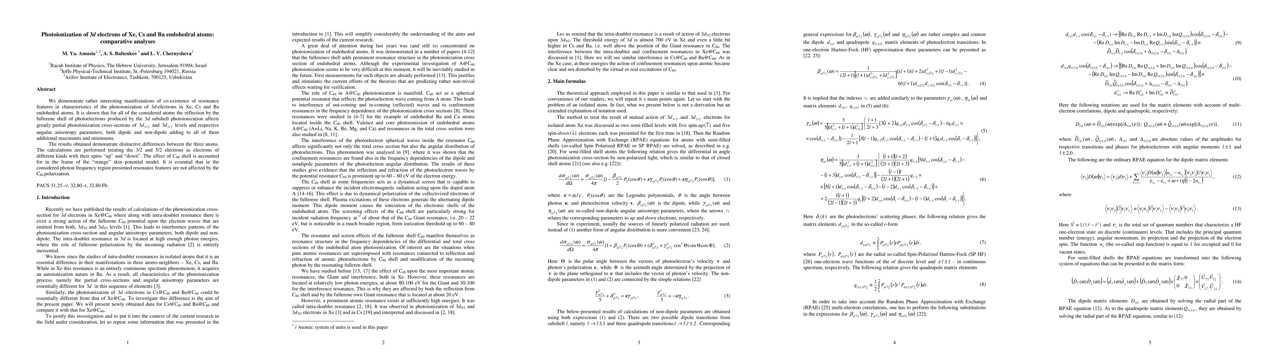 We demonstrate rather interesting manifestations of co-existence of resonance features in characteristics of the photoionization of 3d-electrons in Xe, Cs and Ba endohedral atoms. It is shown that for all of the considered atoms the reflection by the fullerene shell of photoelectrons produced by the 3d subshell photoionization affects greatly partial photoionization cross-sections of 3d5/2 and 3d3/2 levels and respective angular anisotropy parameters, both dipole and non-dipole adding to all of them additional maximums and minimums. The results obtained demonstrate distinctive differences between the three atoms. The calculations are performed treating the 3/2 and 5/2 electrons as electrons of different kinds with their spins "up" and "down". The effect of C60 shell is accounted for in the frame of the "orange" skin potential model. It is essential that in the considered photon frequency region presented resonance features are not affected by the C60 polarization.