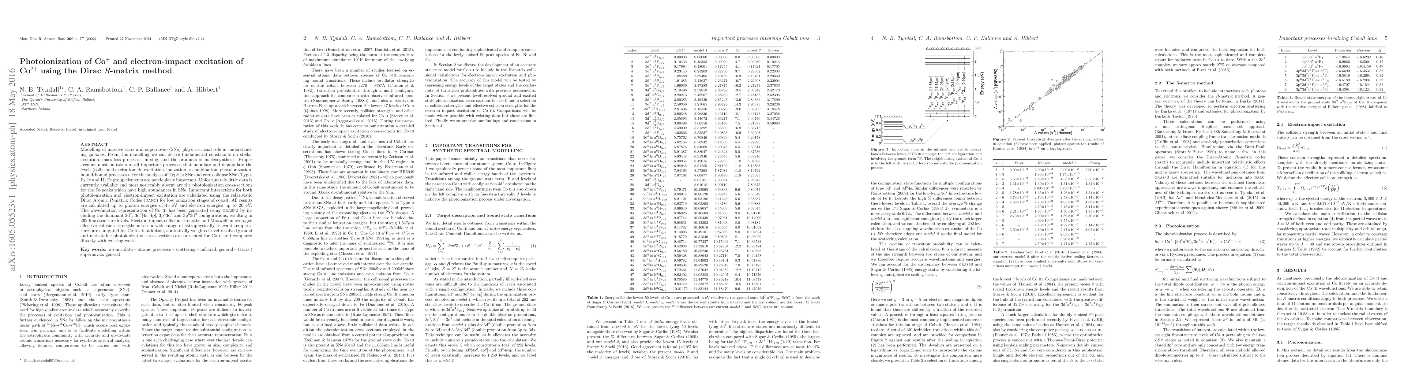 This paper uses the Dirac R-matrix method to calculate photoionization cross-sections and electron-impact excitation for low ionization stages of cobalt, essential for modeling massive stars and supernovae. The study provides detailed collision strengths and photoionization cross-sections for Co II and Co III, addressing the lack of data for Fe-peak elements in supernova environments.