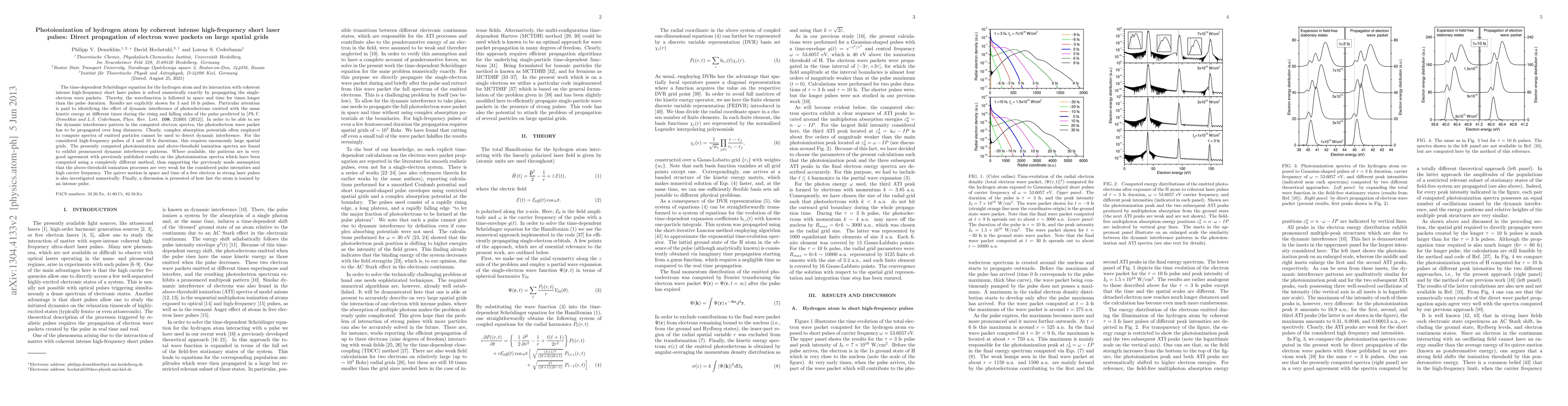 The time-dependent Schr\"{o}dinger equation for the hydrogen atom and its interaction with coherent intense high-frequency short laser pulses is solved numerically exactly by propagating the single-electron wave packets. Thereby, the wavefunction is followed in space and time for times longer than the pulse duration. Results are explicitly shown for 3 and 10 fs pulses. Particular attention is paid to identifying the effect of dynamic interference of photoelectrons emitted with the same kinetic energy at different times during the rising and falling sides of the pulse predicted in [\emph{Ph.V. Demekhin and L.S. Cederbaum}, Phys. Rev. Lett. \textbf{108}, 253001 (2012)]. In order to be able to see the dynamic interference pattern in the computed electron spectra, the photoelectron wave packet has to be propagated over long distances. Clearly, complex absorption potentials often employed to compute spectra of emitted particles cannot be used to detect dynamic interference. For the considered high-frequency pulses of 3 and 10 fs durations, this requires enormously large spatial grids. The presently computed photoionization and above-threshold ionization spectra are found to exhibit pronounced dynamic interference patterns. Where available, the patterns are in very good agreement with previously published results on the photoionization spectra which have been computed using a completely different method, thus supporting the previously made assumption that the above-threshold ionization processes are very weak for the considered pulse intensities and high carrier frequency. The quiver motion in space and time of a free electron in strong laser pulses is also investigated numerically. Finally, a discussion is presented of how fast the atom is ionized by an intense pulse.