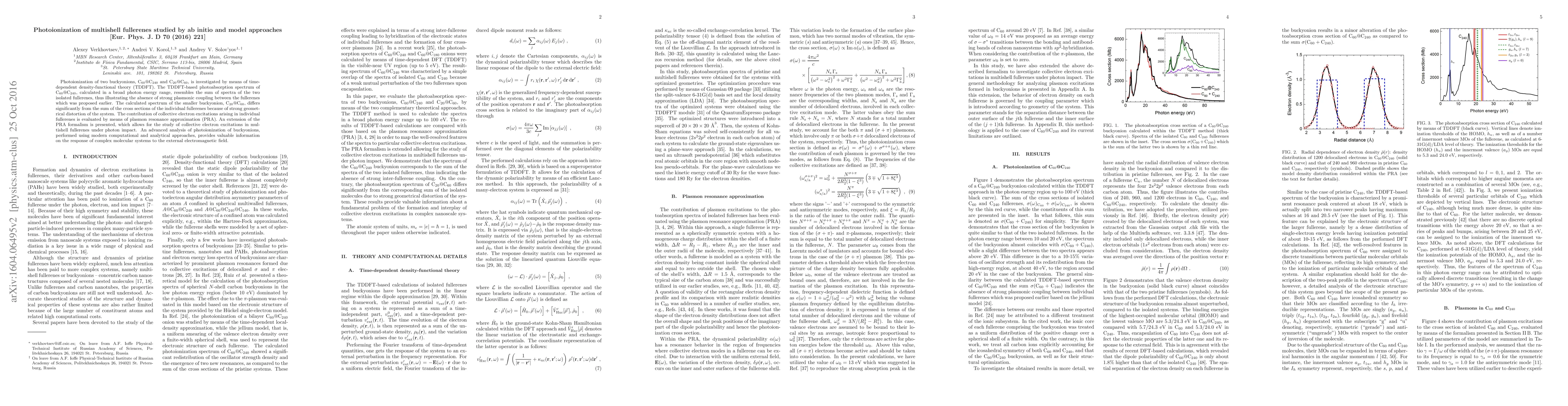 Photoionization of two buckyonions, C$_{60}$@C$_{240}$ and C$_{20}$@C$_{60}$, is investigated by means of time-dependent density-functional theory (TDDFT). The TDDFT-based photoabsorption spectrum of C$_{60}$@C$_{240}$, calculated in a broad photon energy range, resembles the sum of spectra of the two isolated fullerenes, thus illustrating the absence of strong plasmonic coupling between the fullerenes which was proposed earlier. The calculated spectrum of the smaller buckyonion, C$_{20}$@C$_{60}$, differs significantly from the sum of the cross sections of the individual fullerenes because of strong geometrical distortion of the system. The contribution of collective electron excitations arising in individual fullerenes is evaluated by means of plasmon resonance approximation (PRA). An extension of the PRA formalism is presented, which allows for the study of collective electron excitations in multishell fullerenes under photon impact. An advanced analysis of photoionization of buckyonions, performed using modern computational and analytical approaches, provides valuable information on the response of complex molecular systems to the external electromagnetic field.