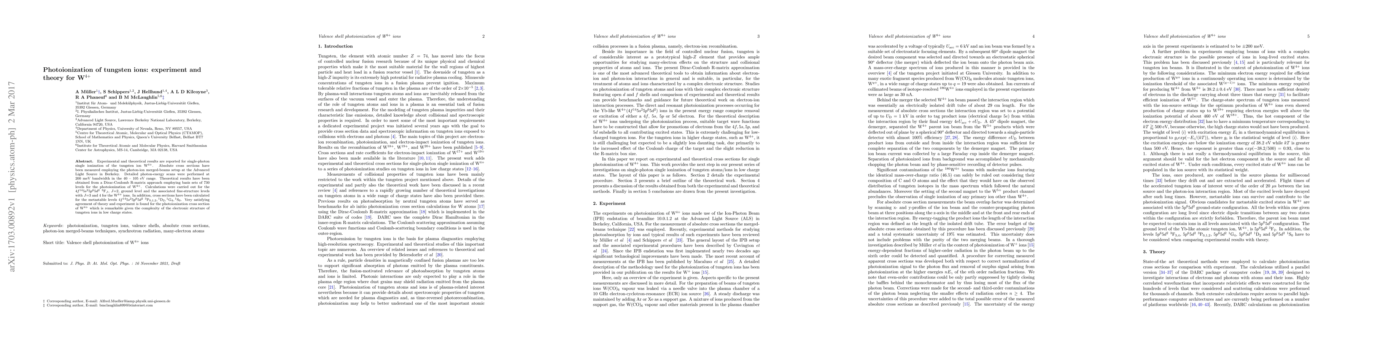 This paper reports experimental and theoretical studies on the single-photon ionization of W$^{4+}$ ions, measuring absolute cross sections at the Advanced Light Source. Theoretical calculations using a Dirac-Coulomb R-matrix approach show very good agreement with experimental results, highlighting the complexity of the tungsten ion's electronic structure.