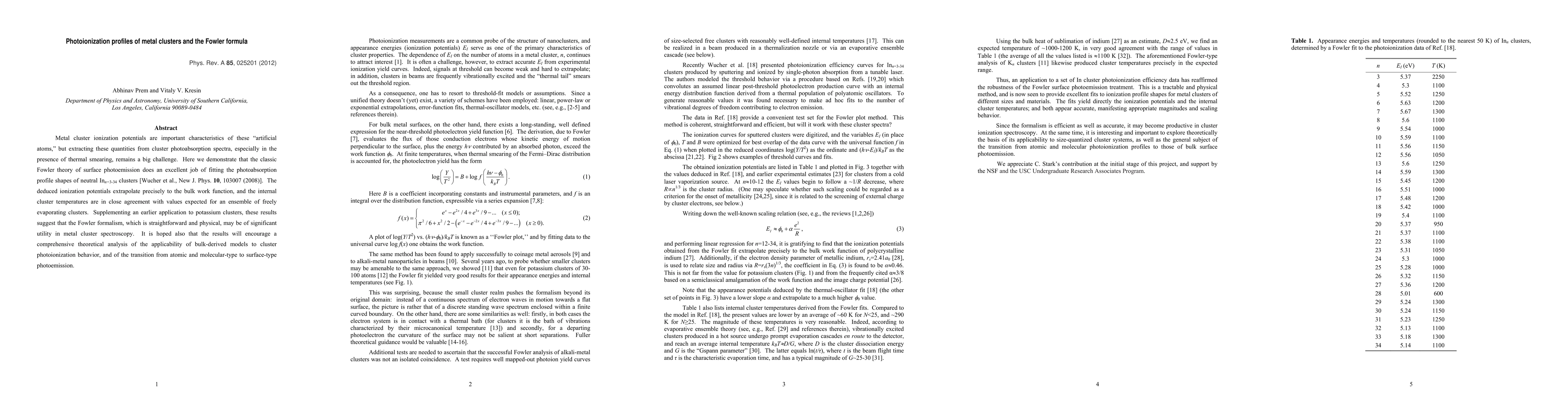 Metal cluster ionization potentials are important characteristics of these "artificial atoms," but extracting these quantities from cluster photoabsorption spectra, especially in the presence of thermal smearing, remains a big challenge. Here we demonstrate that the classic Fowler theory of surface photoemission does an excellent job of fitting the photoabsorption profile shapes of neutral In_{n=3-34} clusters [Wucher et al., New J. Phys. 10, 103007 (2008)]. The deduced ionization potentials extrapolate precisely to the bulk work function, and the internal cluster temperatures are in close agreement with values expected for an ensemble of freely evaporating clusters. Supplementing an earlier application to potassium clusters, these results suggest that the Fowler formalism, which is straightforward and physical, may be of significant utility in metal cluster spectroscopy. It is hoped also that the results will encourage a comprehensive theoretical analysis of the applicability of bulk-derived models to cluster photoionization behavior, and of the transition from atomic and molecular-type to surface-type photoemission.