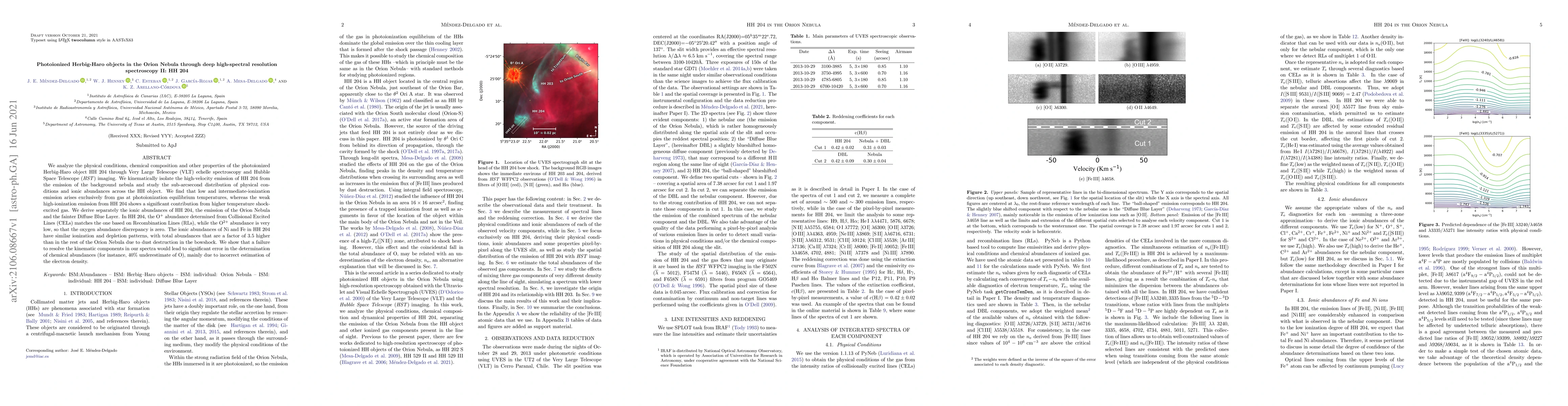 We analyze the physical conditions, chemical composition and other properties of the photoionized Herbig-Haro object HH~204 through Very Large Telescope (VLT) echelle spectroscopy and Hubble Space Telescope (\textit{HST}) imaging. We kinematically isolate the high-velocity emission of HH~204 from the emission of the background nebula and study the sub-arcsecond distribution of physical conditions and ionic abundances across the HH object. We find that low and intermediate-ionization emission arises exclusively from gas at photoionization equilibrium temperatures, whereas the weak high-ionization emission from HH~204 shows a significant contribution from higher temperature shock-excited gas. We derive separately the ionic abundances of HH~204, the emission of the Orion Nebula and the fainter Diffuse Blue Layer.In HH~204, the O$^{+}$ abundance determined from Collisional Excited Lines (CELs) matches the one based on Recombination Lines (RLs), while the O$^{2+}$ abundance is very low, so that the oxygen abundance discrepancy is zero. The ionic abundances of Ni and Fe in HH~204 have similar ionization and depletion patterns, with total abundances that are a factor of 3.5 higher than in the rest of the Orion Nebula due to dust destruction in the bowshock. We show that a failure to resolve the kinematic components in our spectra would lead to significant error in the determination of chemical abundances (for instance, 40\% underestimate of O), mainly due to incorrect estimation of the electron density.