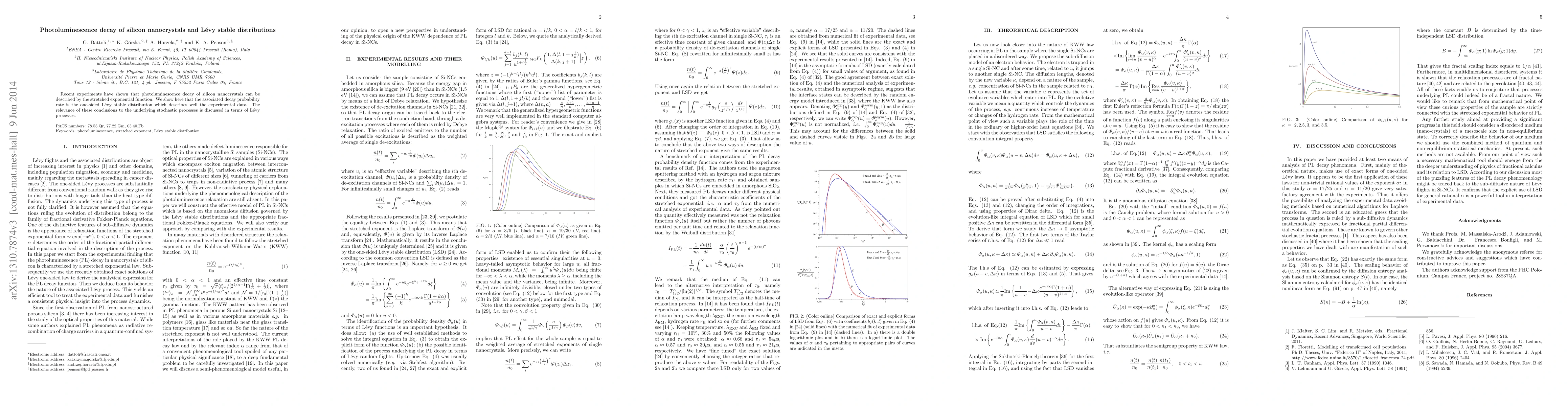 Recent experiments have shown that photoluminescence decay of silicon nanocrystals can be described by the stretched exponential function. We show here that the associated decay probability rate is the one-sided Levy stable distribution which describes well the experimental data. The relevance of these conclusions to the underlying stochastic processes is discussed in terms of Levy processes.