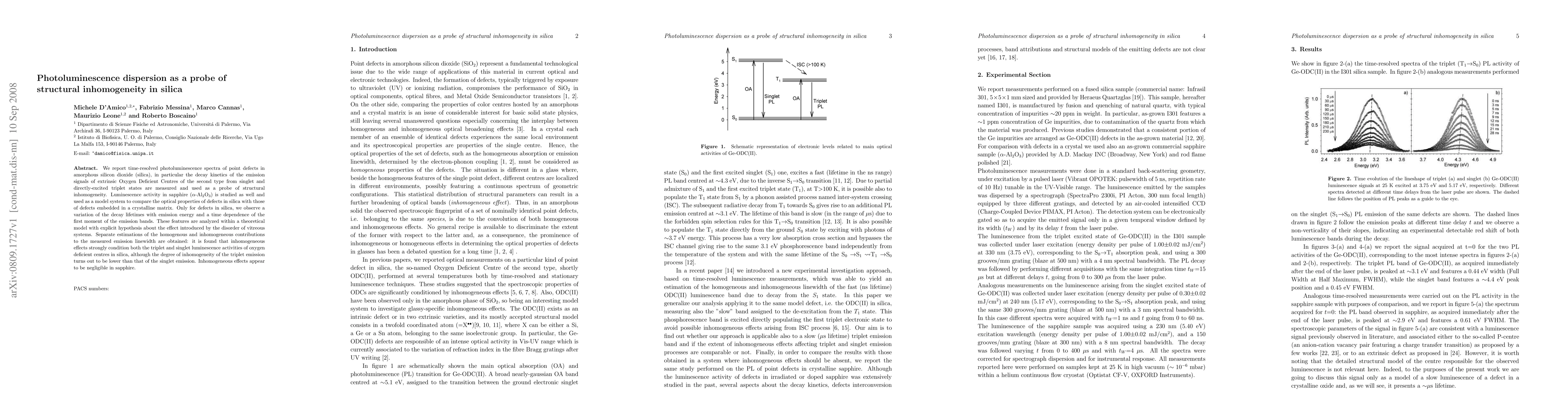 We report time-resolved photoluminescence spectra of point defects in amorphous silicon dioxide (silica), in particular the decay kinetics of the emission signals of extrinsic Oxygen Deficient Centres of the second type from singlet and directly-excited triplet states are measured and used as a probe of structural inhomogeneity. Luminescence activity in sapphire ($\alpha$-Al$_2$O$_3$) is studied as well and used as a model system to compare the optical properties of defects in silica with those of defects embedded in a crystalline matrix. Only for defects in silica, we observe a variation of the decay lifetimes with emission energy and a time dependence of the first moment of the emission bands. These features are analyzed within a theoretical model with explicit hypothesis about the effect introduced by the disorder of vitreous systems. Separate estimations of the homogenous and inhomogeneous contributions to the measured emission linewidth are obtained: it is found that inhomogeneous effects strongly condition both the triplet and singlet luminescence activities of oxygen deficient centres in silica, although the degree of inhomogeneity of the triplet emission turns out to be lower than that of the singlet emission. Inhomogeneous effects appear to be negligible in sapphire.