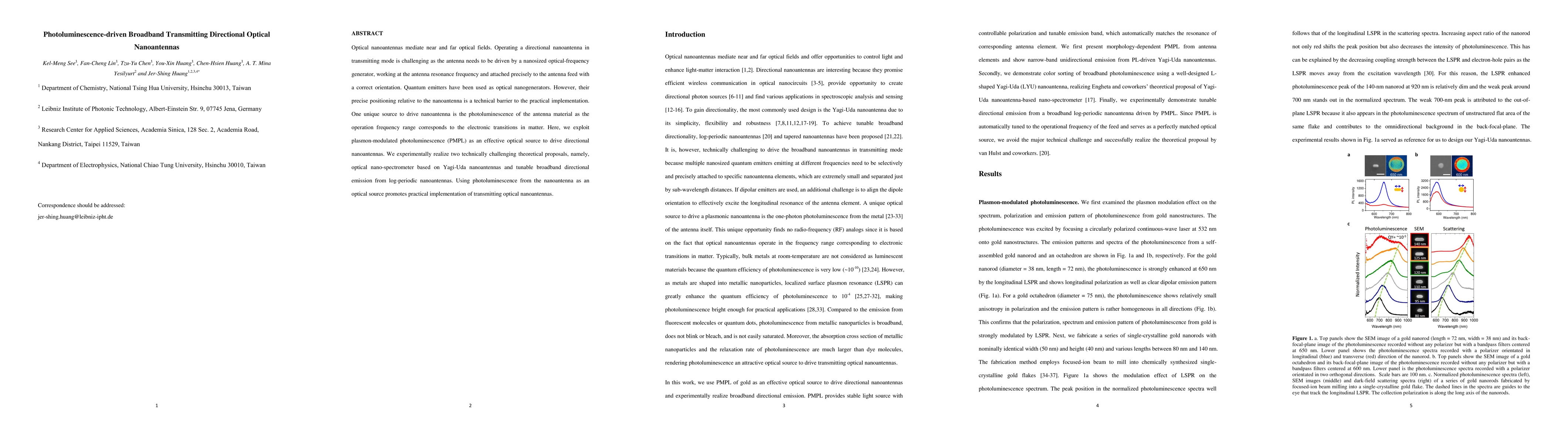 Optical nanoantennas mediate near and far optical fields. Operating a directional nanoantenna in transmitting mode is challenging as the antenna needs to be driven by a nanosized optical-frequency generator, working at the antenna resonance frequency and attached precisely to the antenna feed with a correct orientation. Quantum emitters have been used as optical nanogenerators. However, their precise positioning relative to the nanoantenna is a technical barrier to the practical implementation. One unique source to drive nanoantenna is the photoluminescence of the antenna material as the operation frequency range corresponds to the electronic transitions in matter. Here, we exploit plasmon-modulated photoluminescence (PMPL) as an effective optical source to drive directional nanoantennas. We experimentally realize two technically challenging theoretical proposals, namely, optical nano-spectrometer based on Yagi-Uda nanoantennas and tunable broadband directional emission from log-periodic nanoantennas. Using photoluminescence from the nanoantenna as an optical source promotes practical implementation of transmitting optical nanoantennas.