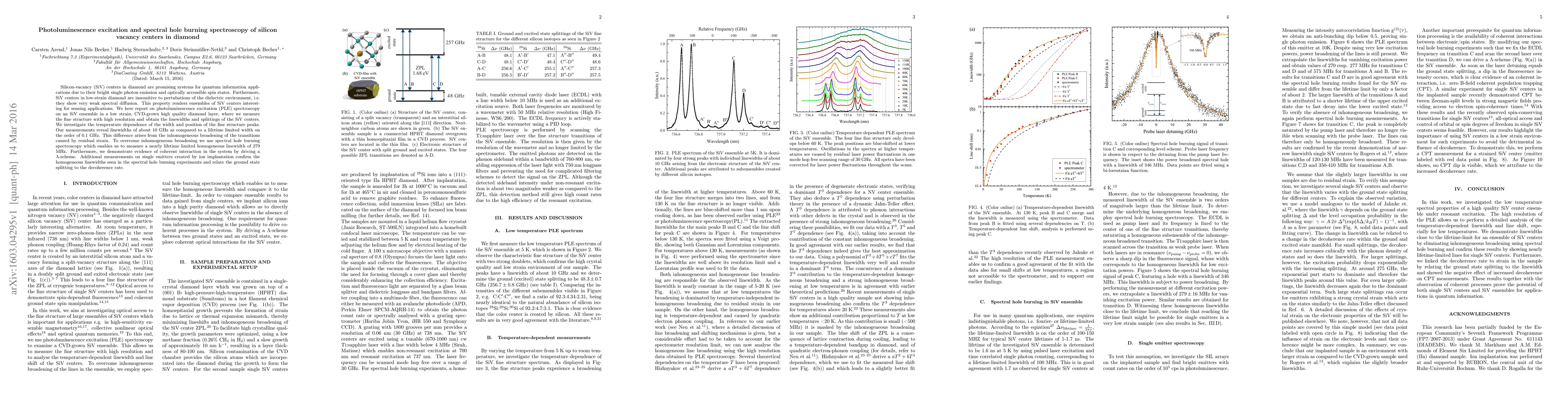 This paper investigates silicon-vacancy (SiV) centers in diamond using photoluminescence excitation and spectral hole burning spectroscopy, revealing linewidths of about 10 GHz due to inhomogeneous broadening from residual strain. Spectral hole burning spectroscopy achieves a nearly lifetime-limited homogeneous linewidth of 279 MHz, demonstrating coherent interactions in the system.