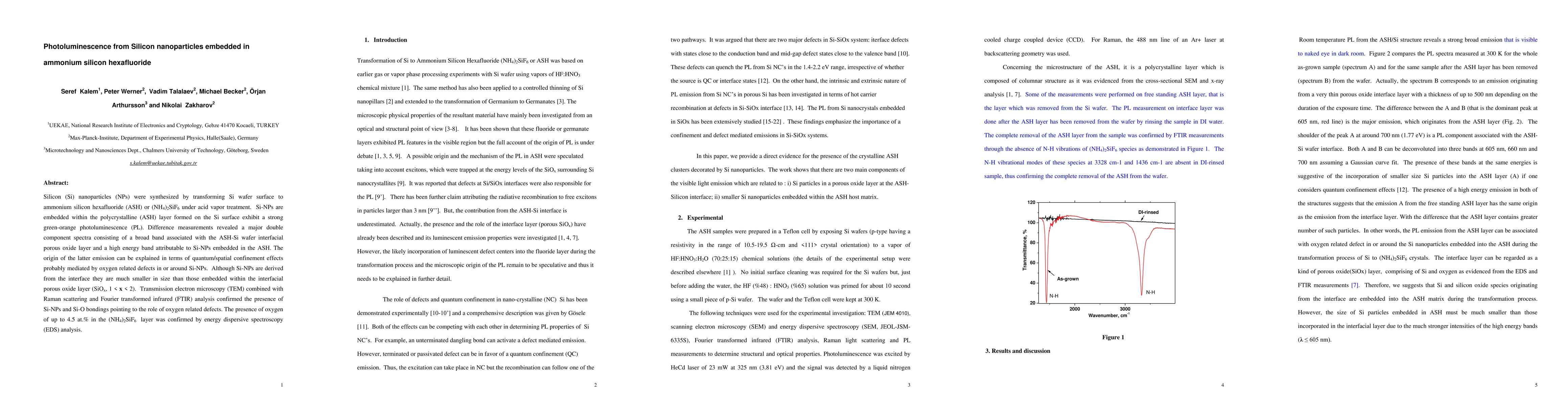 Silicon (Si) nanoparticles (NPs) were synthesized by transforming Si wafer surface to ammonium silicon hexafluoride (ASH) or (NH4)2SiF6 under acid vapor treatment. Si-NPs are embedded within the polycrystalline (ASH) layer formed on the Si surface exhibit a strong green-orange photoluminescence (PL). Difference measurements revealed a major double component spectra consisting of a broad band associated with the ASH-Si wafer interfacial porous oxide layer and a high energy band attributable to Si-NPs embedded in the ASH. The origin of the latter emission can be explained in terms of quantum/spatial confinement effects probably mediated by oxygen related defects in or around Si-NPs. Although Si-NPs are derived from the interface they are much smaller in size than those embedded within the interfacial porous oxide layer (SiOx, 1 < x < 2). Transmission electron microscopy (TEM) combined with Raman scattering and Fourier transformed infrared (FTIR) analysis confirmed the presence of Si-NPs and Si-O bondings pointing to the role of oxygen related defects. The presence of oxygen of up to 4.5 at.% in the (NH4)2SiF6 layer was confirmed by energy dispersive spectroscopy (EDS) analysis.
