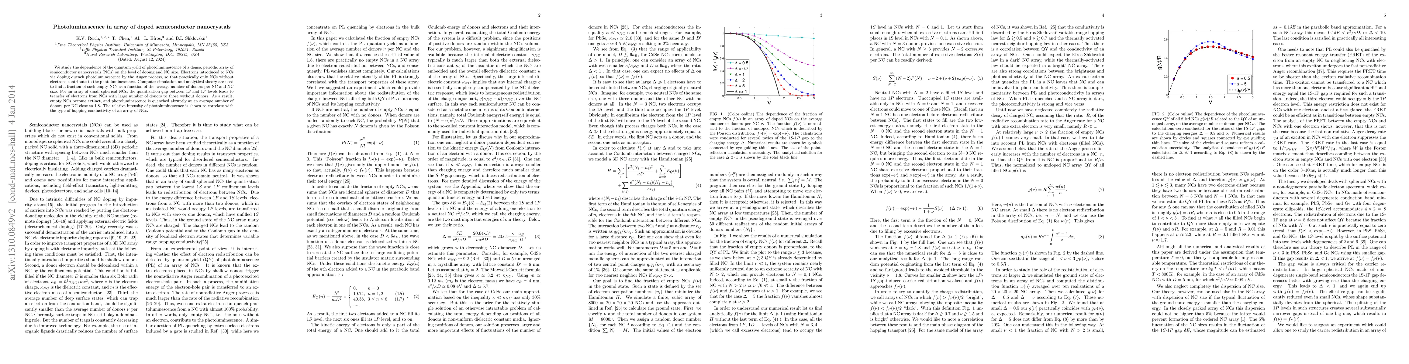 This paper investigates how doping levels and nanocrystal (NC) size affect the photoluminescence quantum yield in a dense array of doped semiconductor NCs. The study reveals that photoluminescence is quenched by the Auger process when electrons are introduced via doping, leading to an abrupt extinction of empty NCs and quenching of photoluminescence at an average donor number close to 1.8.