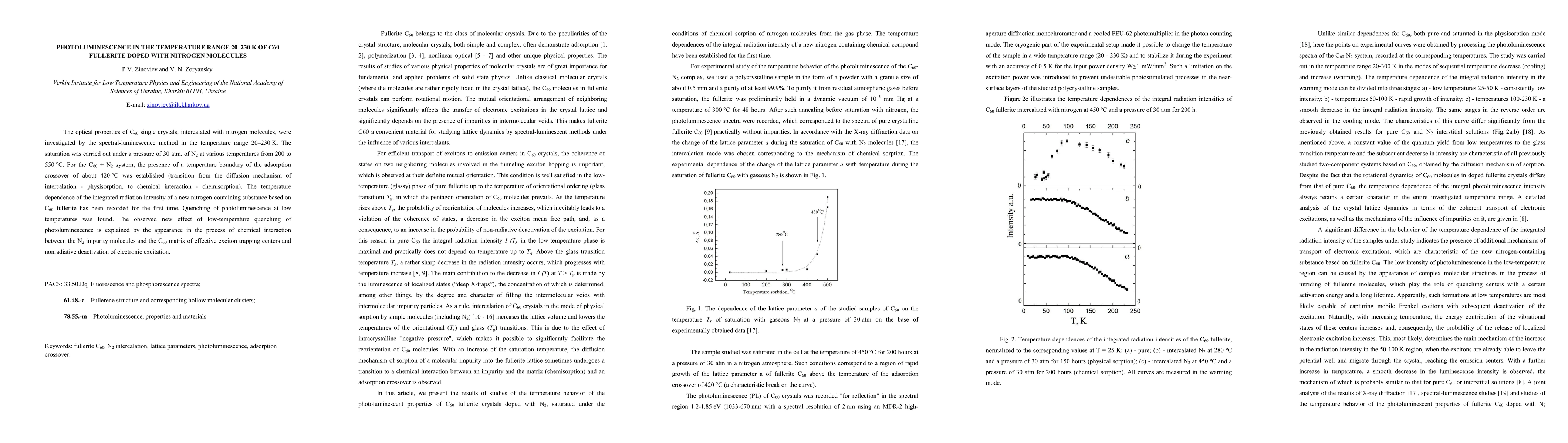 Researchers investigated C60 fullerite doped with nitrogen molecules under various temperatures and pressures, discovering a temperature boundary of adsorption crossover at 420°C and observing low-temperature quenching of photoluminescence due to exciton trapping centers.