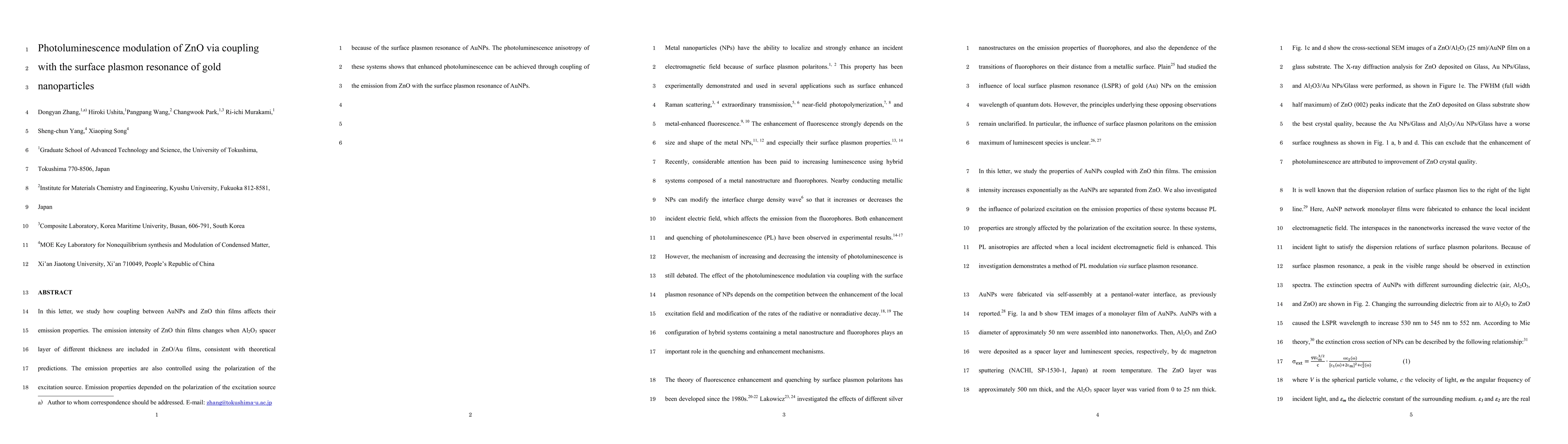 This study investigates how coupling between gold nanoparticles (AuNPs) and ZnO thin films modulates ZnO's photoluminescence, showing that emission intensity varies with the thickness of an Al2O3 spacer layer and is influenced by the polarization of the excitation source due to the surface plasmon resonance of AuNPs. Enhanced photoluminescence is achieved through this coupling.