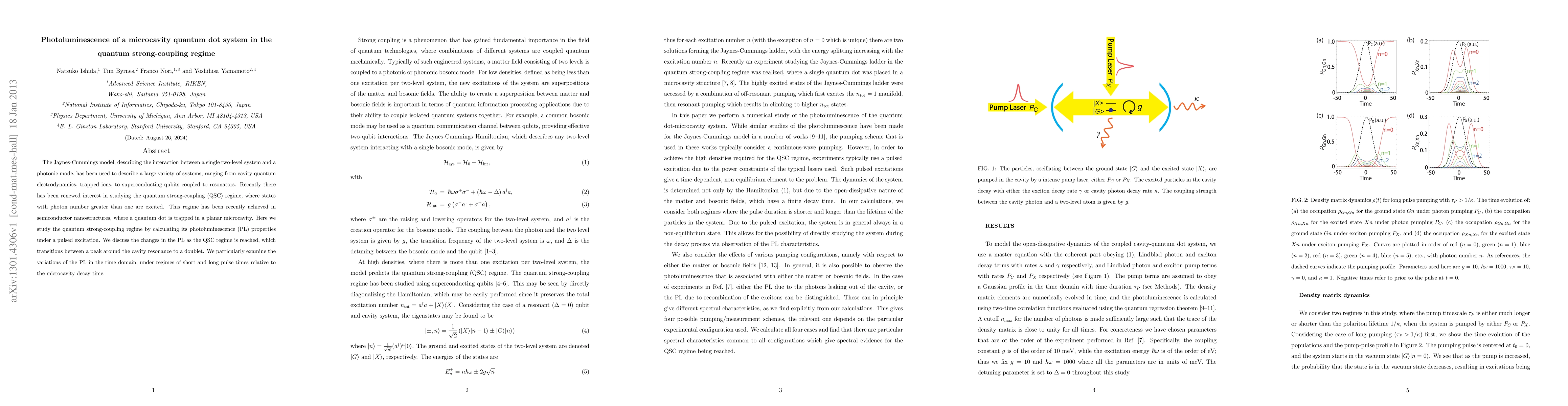 The Jaynes-Cummings model, describing the interaction between a single two-level system and a photonic mode, has been used to describe a large variety of systems, ranging from cavity quantum electrodynamics, trapped ions, to superconducting qubits coupled to resonators. Recently there has been renewed interest in studying the quantum strong-coupling (QSC) regime, where states with photon number greater than one are excited. This regime has been recently achieved in semiconductor nanostructures, where a quantum dot is trapped in a planar microcavity. Here we study the quantum strong-coupling regime by calculating its photoluminescence (PL) properties under a pulsed excitation. We discuss the changes in the PL as the QSC regime is reached, which transitions between a peak around the cavity resonance to a doublet. We particularly examine the variations of the PL in the time domain, under regimes of short and long pulse times relative to the microcavity decay time.