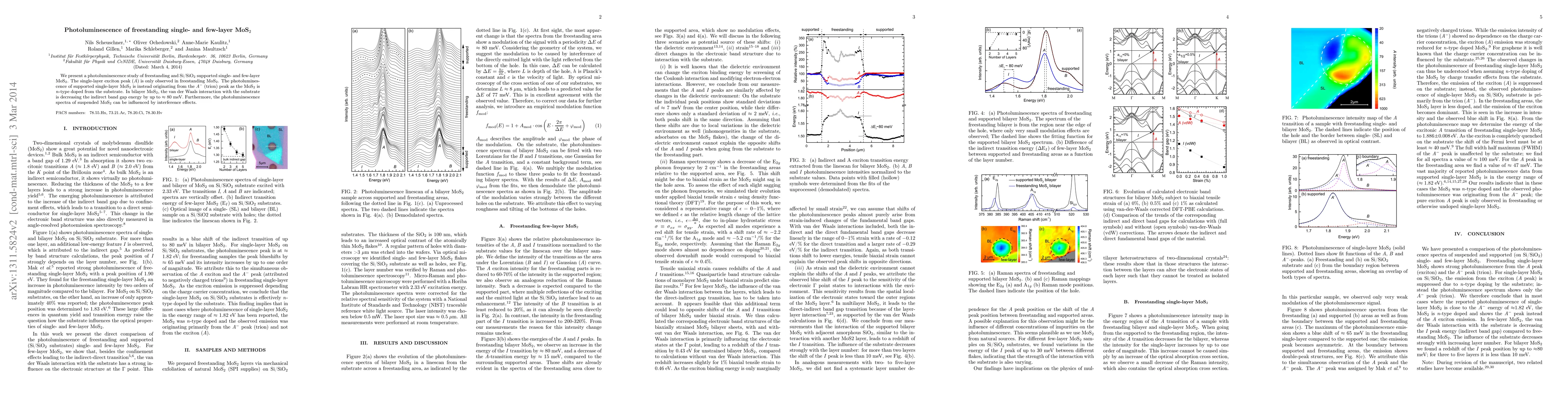 This study investigates the photoluminescence properties of freestanding and supported single- and few-layer MoS2, revealing that the single-layer exciton peak is present only in freestanding MoS2, while the A- (trion) peak dominates in supported samples due to substrate-induced n-type doping. In bilayer MoS2, substrate interaction reduces the indirect band gap by ~80 meV.