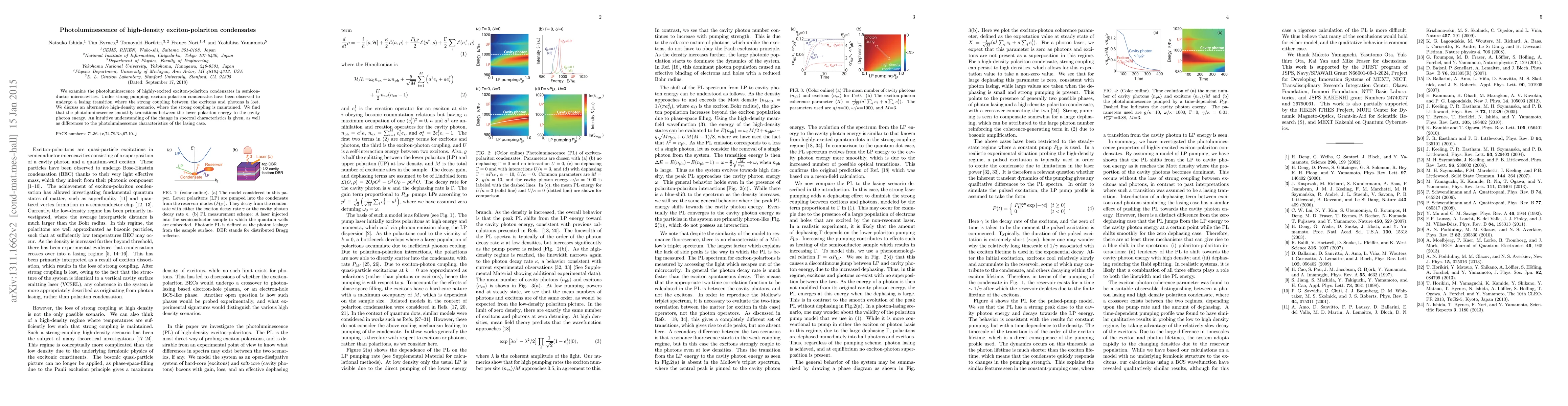 We examine the photoluminescence of highly-excited exciton-polariton condensates in semiconductor microcavities. Under strong pumping, exciton-polariton condensates have been observed to undergo a lasing transition where strong coupling between the excitons and photons is lost. We discuss an alternative high-density scenario, where the strong coupling is maintained. We find that the photoluminescence smoothly transitions between the lower polariton energy to the cavity photon energy. An intuitive understanding of the change in spectral characteristics is given, as well as differences to the photoluminescence characteristics of the lasing case.