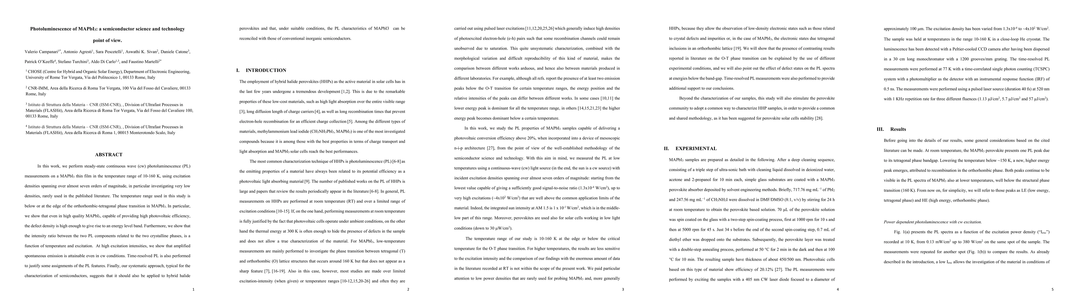 In this work, we perform steady-state continuous wave (cw) photoluminescence (PL) measurements on a MAPbI$_3$ thin film in the temperature range of 10-160 K, using excitation densities spanning over almost seven orders of magnitude, in particular investigating very low densities, rarely used in the published literature. The temperature range used in this study is below or at the edge of the orthorhombic-tetragonal phase transition in MAPbI$_3$. In particular, we show that even in high quality MAPbI$_3$, capable of providing high photovoltaic efficiency, the defect density is high enough to give rise to an energy level band. Furthermore, we show that the intensity ratio between the two PL components related to the two crystalline phases, is a function of temperature and excitation. At high excitation intensities, we show that amplified spontaneous emission is attainable even in cw conditions. Time-resolved PL is also performed to justify some assignments of the PL features. Finally, our systematic approach, typical for the characterization of semiconductors, suggests that it should also be applied to hybrid halide perovskites and that, under suitable conditions, the PL characteristics of MAPbI$_3$ can be reconciled with those of conventional inorganic semiconductors.