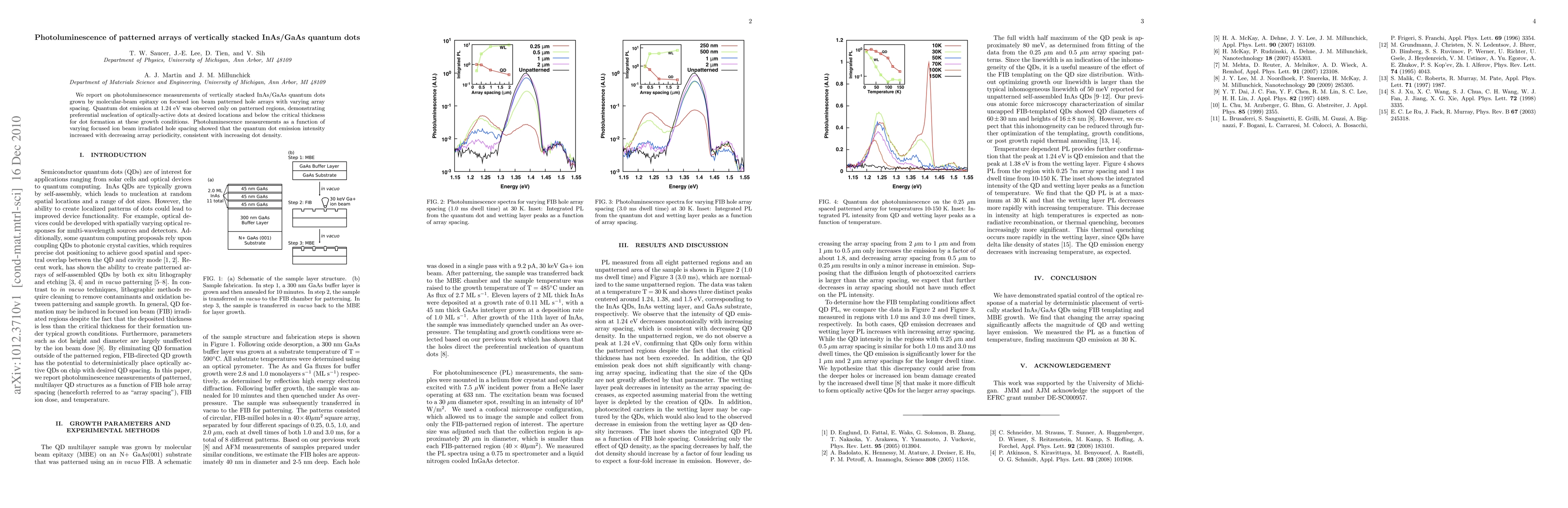 This study investigates the photoluminescence of vertically stacked InAs/GaAs quantum dots grown on patterned arrays via molecular-beam epitaxy, revealing preferential nucleation of optically-active dots at desired locations. The emission intensity increases with decreasing array spacing, indicating a higher dot density.