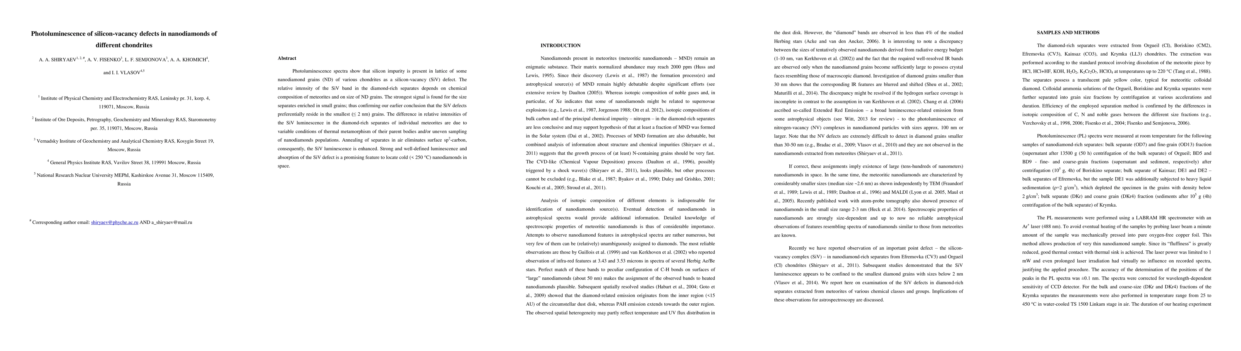 This study reveals the presence of silicon-vacancy defects in nanodiamonds from various chondrites through photoluminescence, with the strongest signal in the smallest nanodiamond grains. Variations in SiV luminescence intensity are attributed to meteorite parent body thermal metamorphism and sampling differences.